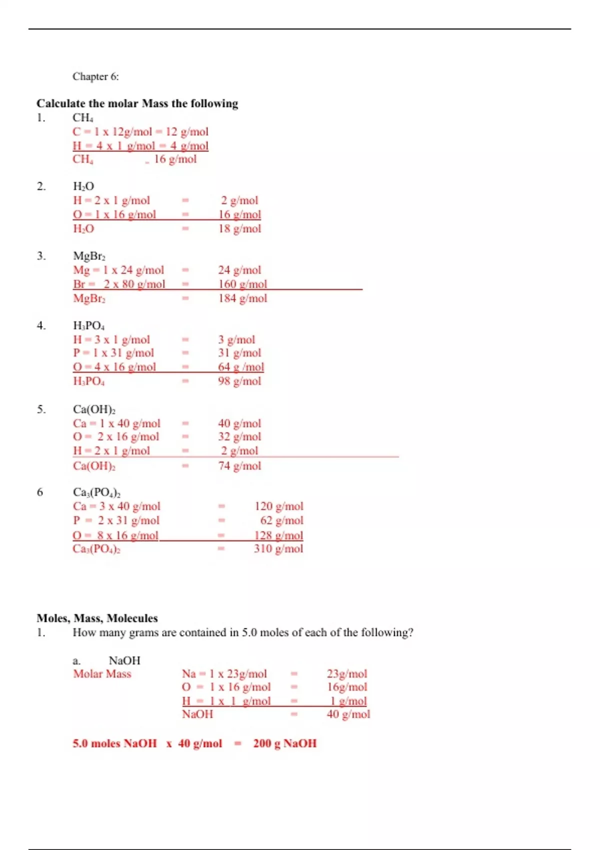 1. How many grams are contained in 5.0 moles of each of the following?