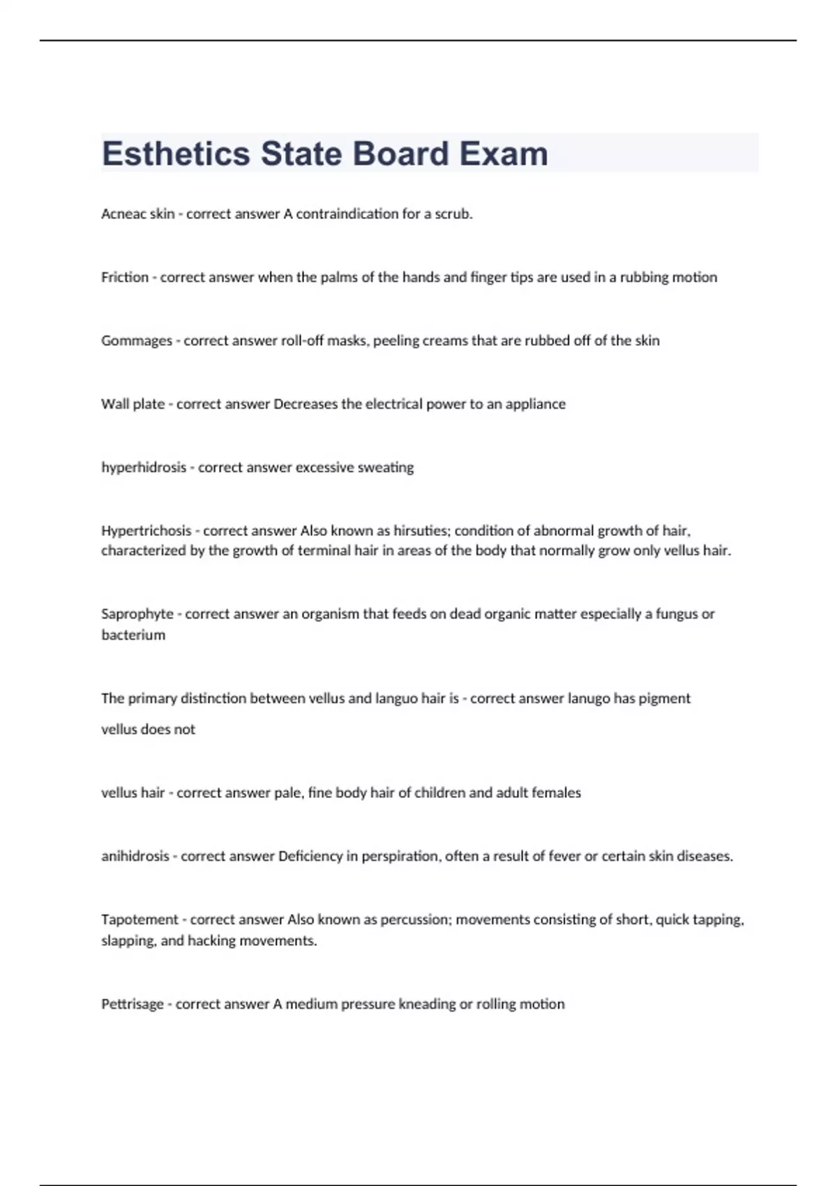 Acneac skin - correct answer A contraindication for a scrub. Friction - correct answer when the palms of the hands and finger tips are used in a rubbing motion Gommages - correct answer roll-off masks, peeling creams that are rubbed off of the skin Wall plate - correct answer Decreases the electrical power to an appliance hyperhidrosis - correct answer excessive sweating Hypertrichosis - correct answer Also known as hirsuties; condition of abnormal growth of hair, characterized by the growth of terminal hair in areas of the body that normally grow only vellus hair. Saprophyte - correct answer an organism that feeds on dead organic matter especially a fungus or bacterium The primary distinction between vellus and languo hair is - correct answer lanugo has pigment vellus does not vellus hair - correct answer pale, fine body hair of children and adult females anihidrosis - correct answer Deficiency in perspiration, often a result of fever or certain skin diseases. Tapotement - correct answer Also known as percussion; movements consisting of short, quick tapping, slapping, and
