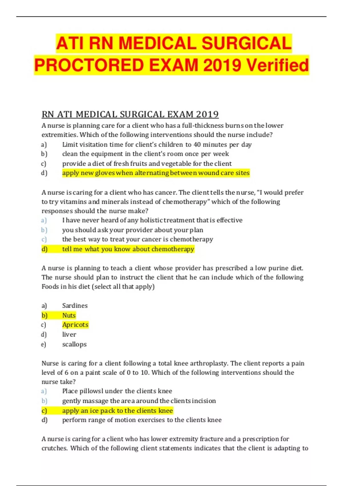 ATI RN MEDICAL SURGICAL PROCTORED EXAM 2019 Verified RN ATI MEDICAL SURGICAL EXAM 2019 A nurse is planning care for a client who has a full-thickness burns on the lower extremities. Which of the following interventions should the nurse include? a) Limit visitation time for client’s children to 40 minutes per day b) clean the equipment in the client's room once per week c) provide a diet of fresh fruits and vegetable for the client d) apply new gloves when alternating between wound care sites A nurse is caring for a client who has cancer. The client tells the nurse, “I would prefer to try vitamins and minerals instead of chemotherapy” which of the following responses should the nurse make? a) I have never heard of any holistic treatment that is effective b) you should ask your provider about your plan c) the best way to treat your cancer is chemotherapy d) tell me what you know about chemotherapy A nurse is planning to teach a client whose provider has prescribed a low purine diet. The nurse should plan to instruct the client that he can include which of the following Foods in his diet (select all that apply) a) Sardines b) Nuts c) Apricots d) liver e) scallops Nurse is caring for a client following a total knee arthroplasty. The client reports a pain level of 6 on a paint scale of 0 to 10. Which of the following interventions should the nurse take? a) Place pillowsl under the clients knee b) gently massage the area around the clients incision c) apply an ice pack to the clients knee d) perform range of motion exercises to the clients knee A nurse is caring for a client who has lower extremity fracture and a prescription for crutches. Which of the following client statements indicates that the client is adapting to their role change? a) I will need to have my partner take over shopping for groceries and cooking the meals for us b) Its going to be difficult to tell my parents I can't take them to their appointments anymore c) I feel bad that I have to ask my partner to keep the house clean d) These crutches will make it impossible to care for my child A nurse is assessing a client who is preoperative and reports an allergy to bananas. The nurse should recognize that the client is at risk for an allergic cross-reactivity to which of the following substances? a) adhesive tape b) Latex c) Anesthetics d) povidone iodine A nurse on a medical unit is planning care for a group of clients. Which of the following clients should the nurse attend to First? a) A client who has chronic obstructive pulmonary disease in oxygen saturation of 89% b) a client who has left-sided paralysis and slurred speech from a prior stroke c) a client who has thrombocytopenia and reports a nosebleed d) a client who has multiple sclerosis and reports Ataxia and vertigo A nurse is monitoring a client who is receiving two units packed RBC's. Which of the following manifestation indicates a hemolytic transfusion reaction? a) back pain b) Hypertension c) Chills d) bradycardia A nurse is teaching a client who has diabetes mellitus about foot care. Which of the following instruction should the nurse include? a) Use a heating pad to keep your feet warm at night b) wear loose-fitting slippers around the house c) where cotton rather than nylon socks d) wash your face twice per day with antibacterial soap and hot water A nurse is providing teaching to a client who has a deep vein thrombosis (DVT) . Which of the following findings should the nurse identify as a risk factor for the development of the DVTs? a) NSAID us