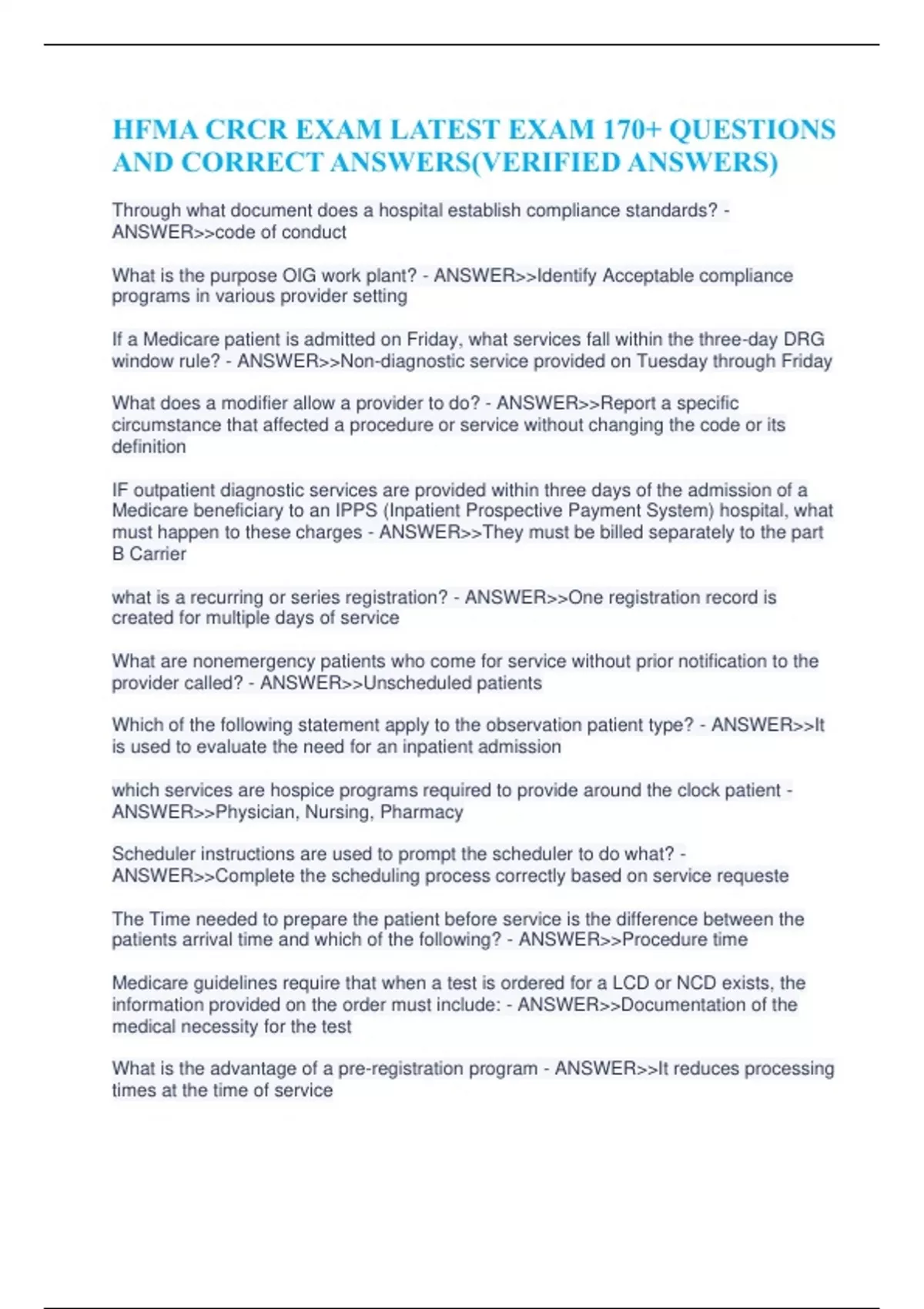 HFMA CRCR EXAM LATEST EXAM 170+ QUESTIONS AND CORRECT ANSWERS(VERIFIED ANSWERS)