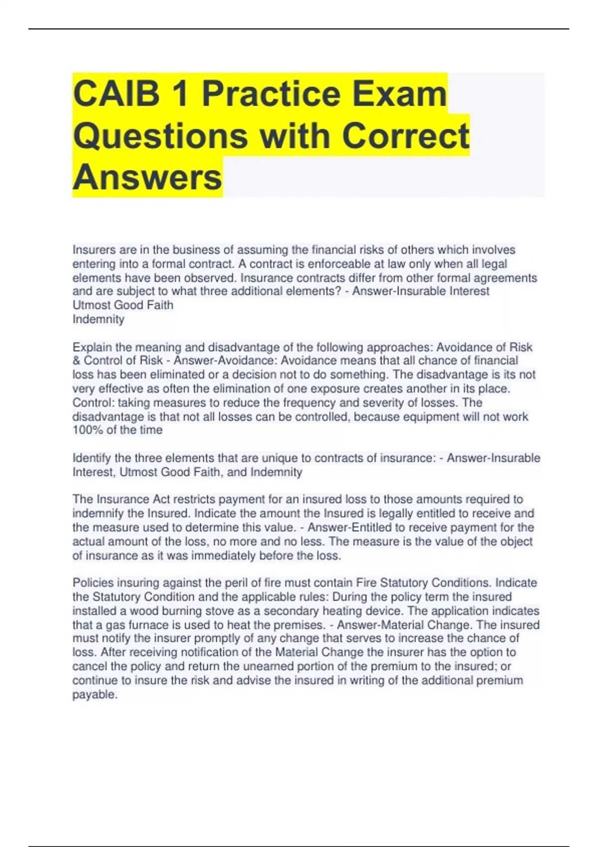 CAIB 1 Practice Exam Questions with Correct Answers Insurers are in the business of assuming the financial risks of others which involves entering into a formal contract. A contract is enforceable at law only when all legal elements have been observed. Insurance contracts differ from other formal agreements and are subject to what three additional elements? - Answer-Insurable Interest Utmost Good Faith Indemnity Explain the meaning and disadvantage of the following approaches: Avoidance of Risk & Control of Risk - Answer-Avoidance: Avoidance means that all chance of financial loss has been eliminated or a decision not to do something. The disadvantage is its not very effective as often the elimination of one exposure creates another in its place. Control: taking measures to reduce the frequency and severity of losses. The disadvantage is that not all losses can be controlled, because equipment will not work 100% of the time Identify the three elements that are unique to contracts of insurance: - Answer-Insurable Interest, Utmost Good Faith, and Indemnity The Insurance Act restricts payment for an insured loss to those amounts required to indemnify the Insured. Indicate the amount the Insured is legally entitled to receive and the measure used to determine this value. - Answer-Entitled to receive payment for the actual amount of the loss, no more and no less. The measure is the value of the object of insurance as it was immediately before the loss. Policies insuring against the peril of fire must contain Fire Statutory Conditions. Indicate the Statutory Condition and the applicable rules: During the policy term the insured installed a wood burning stove as a secondary heating device. The application indicates that a gas furnace is used to heat the premises. - Answer-Material Change. The insured must notify the insurer promptly of any change that serves to increase the chance of loss. After receiving notification of the Material Change the insurer has the option to cancel the policy and return the unearned portion of the premium to the insured; or continue to insure the risk and advise the insured in writing of the additional premium payable. All Homeowners policies describe the Basis of Claim Payment for loss or damage to dwelling building, detached private structures and personal property. Indicate the basis of settlement and conditions: Water used to extinguish a small fire at the Insured's home destroyed all electronic media and records kept by the Insured. - Answer-Cost to reproduce lost or damage media from duplicates or from originals of the previous generation of the media. The payment for lost records is the cost of blank books, pages, cards or other materials plus the cost of actually transcribing or copying such records. Another option for insuring property values under Homeowners policies is the "Single Limit" basis. Explain how this basis differs from the usual coverage format and the advantage that this approach offers: - Answer-Coverages A to D are combined into one single limit. The advantage is that this approach eliminates the coverage restriction otherwise applicable to Coverages B, C and D.