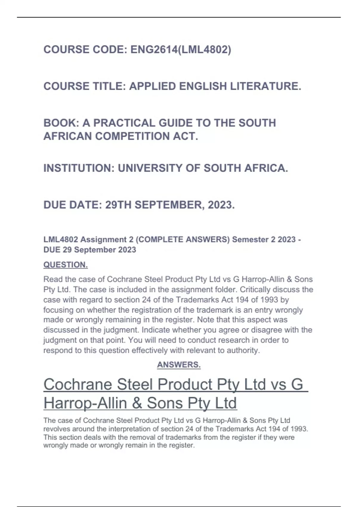 LML4802 Assignment 2 (COMPLETE ANSWERS) Semester 2 2023 - DUE 29 September 2023 100% TRUSTED workings, explanations and solutions. for assistance ..... Read the case of Cochrane Steel Product Pty Ltd vs G Harrop-Allin & Sons Pty Ltd. The case is included in the assignment folder. Critically discuss the case with regard to section 24 of the Trademarks Act 194 of 1993 by focusing on whether the registration of the trademark is an entry wrongly made or wrongly remaining in the register. Note that this aspect was discussed in the judgment. Indicate whether you agree or disagree with the judgment on that point. You will need to conduct research in order to respond to this question effectively with relevant to authority.