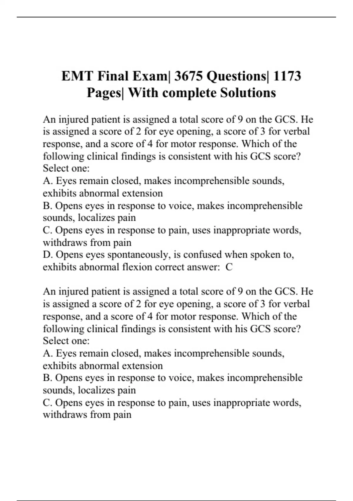 EMT Final Exam| 3675 Questions| 1173 Pages| With complete Solutions