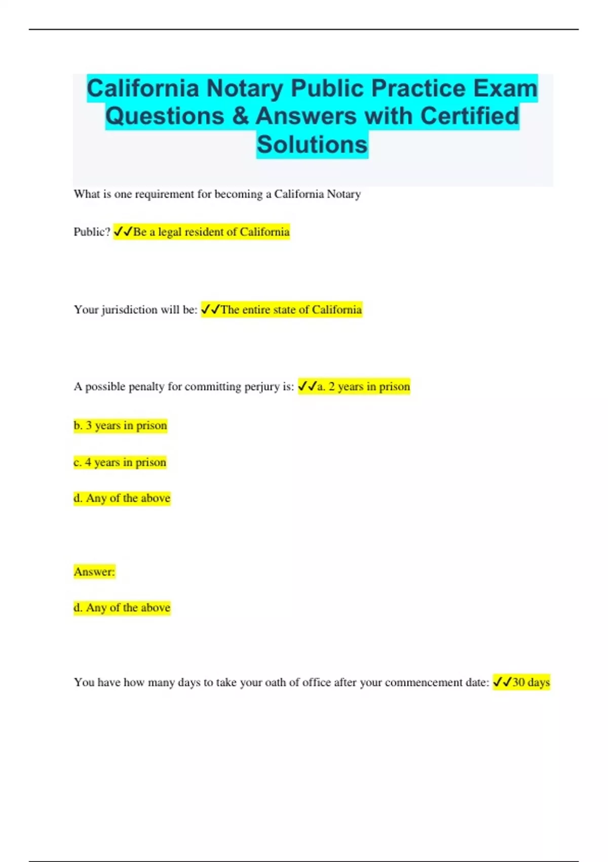 What is one requirement for becoming a California Notary Public? Be a legal resident of California Your jurisdiction will be: The entire state of California A possible penalty for committing perjury is: a. 2 years in prison