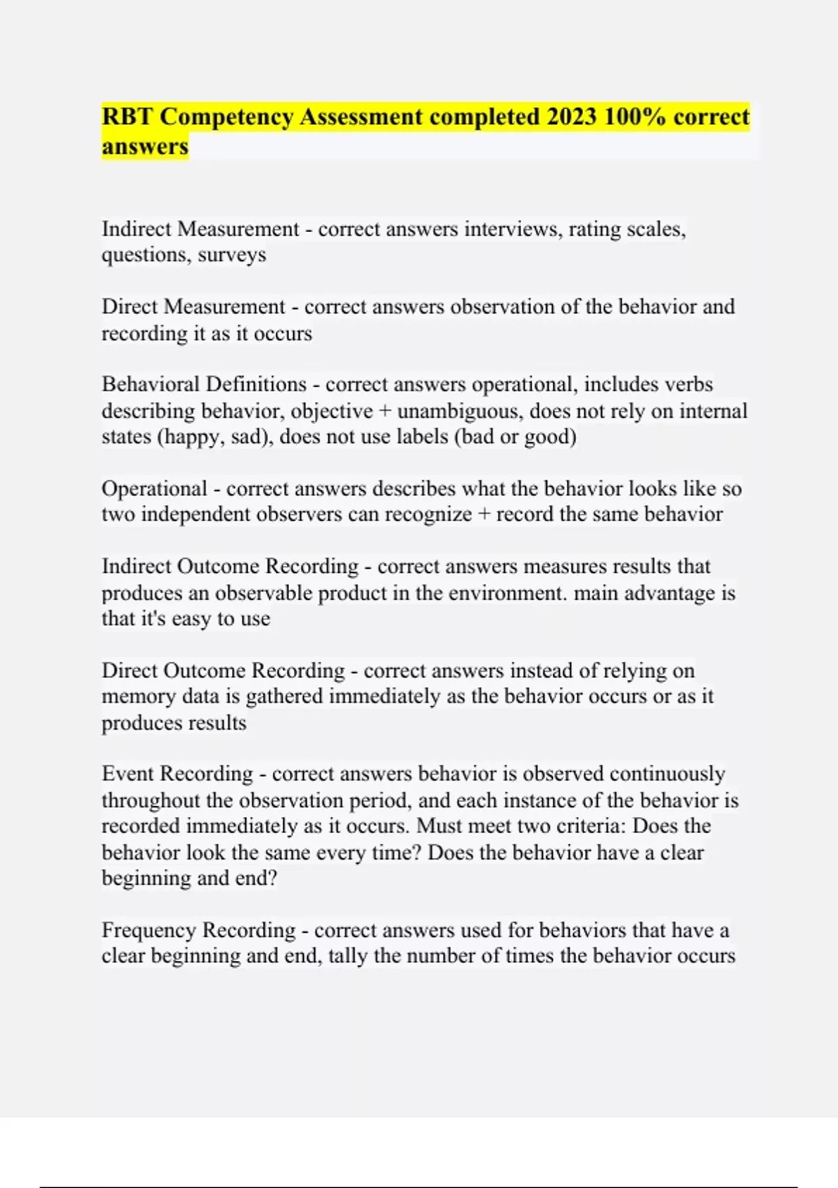 Indirect Measurement - correct answers interviews, rating scales, questions, surveys Direct Measurement - correct answers observation of the behavior and recording it as it occurs Behavioral Definitions - correct answers operational, includes verbs describing behavior, objective + unambiguous, does not rely on internal states (happy, sad), does not use labels (bad or good) Operational - correct answers describes what the behavior looks like so two independent observers can recognize + record the same behavior Indirect Outcome Recording - correct answers measures results that produces an observable product in the environment. main advantage is that it's easy to use