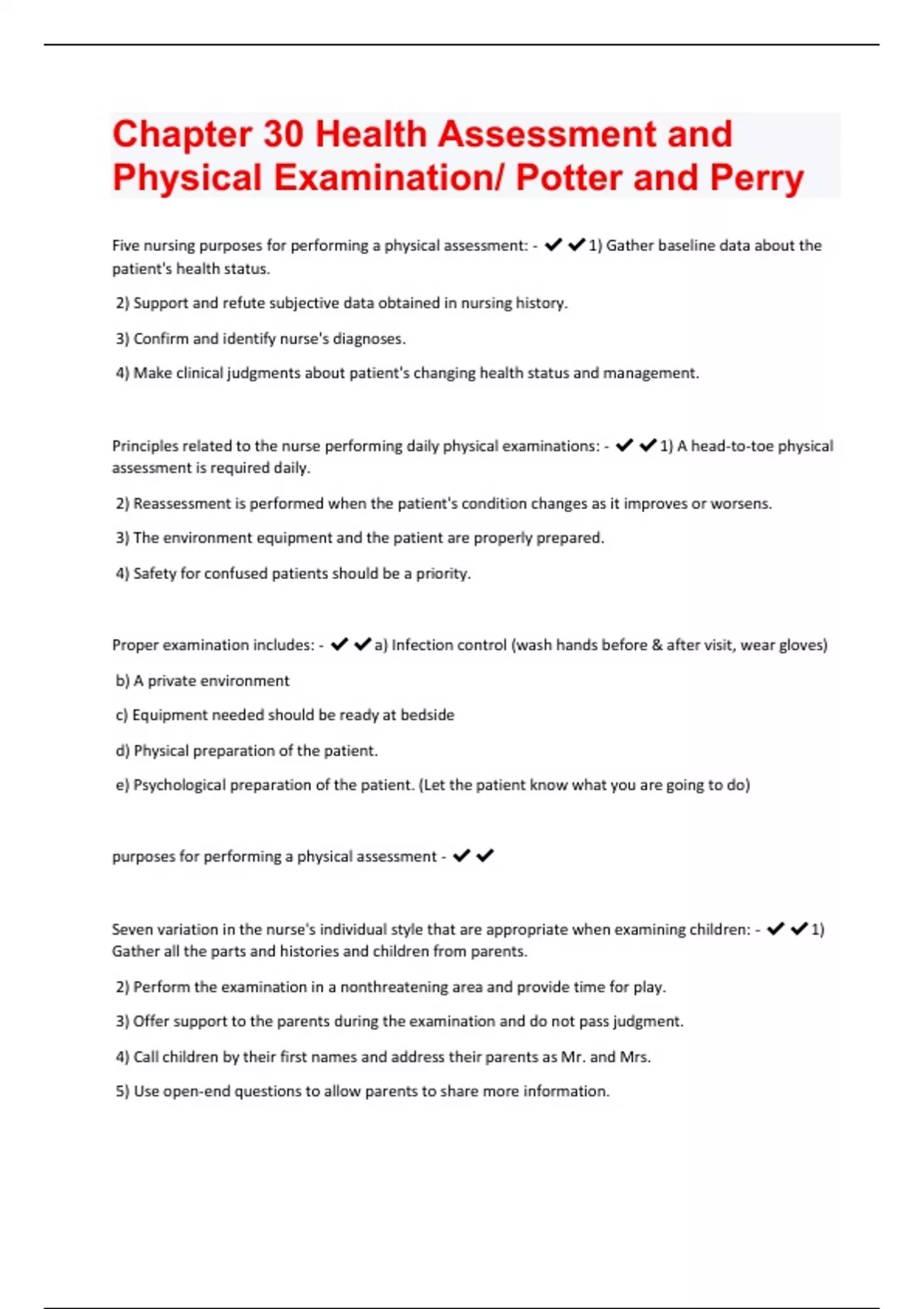 Five nursing purposes for performing a physical assessment: - 1) Gather baseline data about the patient's health status. 2) Support and refute subjective data obtained in nursing history. 3) Confirm and identify nurse's diagnoses. 4) Make clinical judgments about patient's changing health status and management. Principles related to the nurse performing daily physical examinations: - 1) A head-to-toe physical assessment is required daily. 2) Reassessment is performed when the patient's condition changes as it improves or worsens. 3) The environment equipment and the patient are properly prepared. 4) Safety for confused patients should be a priority. Proper examination includes: - a) Infection control (wash hands before & after visit, wear gloves) b) A private environment c) Equipment needed should be ready at bedside d) Physical preparation of the patient. e) Psychological preparation of the patient. (Let the patient know what you are going to do) purposes for performing a physical assessment - Seven variation in the nurse's individual style that are appropriate when examining children: - 1) Gather all the parts and histories and children from parents. 2) Perform the examination in a nonthreatening area and provide time for play. 3) Offer support to the parents during the examination and do not pass judgment. 4) Call children by their first names and address their parents as Mr. and Mrs. 5) Use open-end questions to allow parents to share more information.6) Treat adolescents as adults. 7) Provide confidentiality for adolescents; speak to them alone. Seven variations in the nurse's individual style that are appropriate when examining and older adult. - 1) Do not stereotype the aging patients' level of cognition. 2) Be sensitive to sensory or physical limitations, (more time). 3) Adequate space is needed. 4) Use patience, allow for pauses, and observe for details. 5) Certain types of information may be stressful to give. 6) Perform examination near bathroom facilities. 7) Be alert for signs of increasing fatigue. Principles to follow to keep an examination well organized: - 1) Compare both sides for symmetry 2) If the patient is ill, first assess the systems of the body part that is most at risk. 3) Offer rest periods if the patient becomes fatigued. 4) Record assessments in specific terms in the record. 5) Use common and accepted medical terms and abbreviations. 6) Record quick notes during examination to avoid delays. Inspection: - Is looking, listening and smelling to distinguish normal form abnormal findings. Guidelines to achieve the best results during inspection: - a) Adequate lighting is available. b) Use a direct light source. c) Inspect each area for size, shape, and color. d) Position and expose body parts as needed, maintaining privacy. e) Validate findings with the patient. Palpation: - Involves using hands to touch body palpation - involves pressing inward 1 cm (superficial) Deep palpation - involves depressing the area 4 cm to assess the condition of organs.