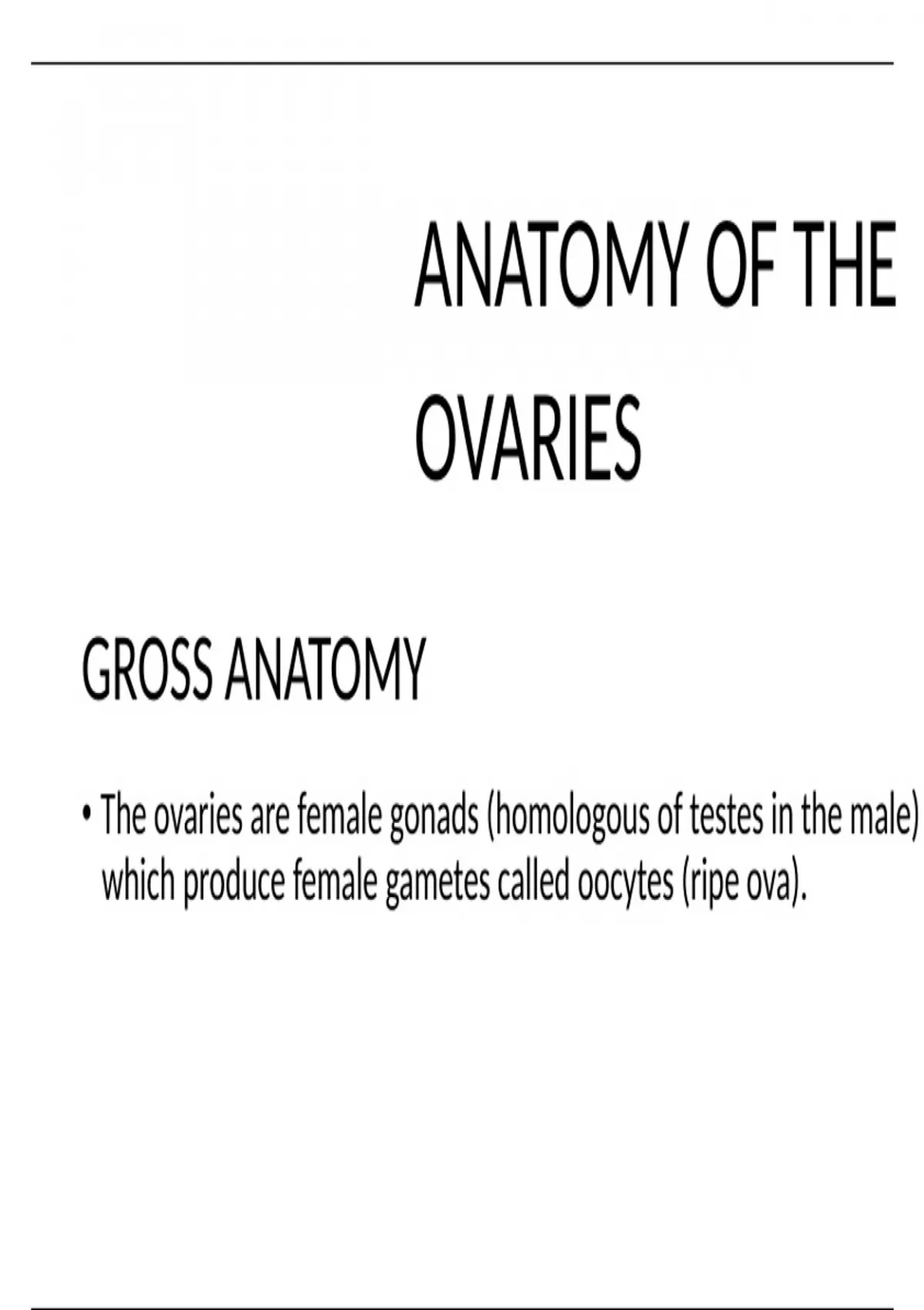 ANATOMY OF THE OVARIES GROSS ANATOMY • The ovaries are female gonads (homologous of testes in the male) which produce female gametes called oocytes (ripe ova). . Each ovary is about 4 cm long, 2 cm wide and 1 cm thick. • LOCATION • In nulliparous adult women, each ovary lies in the ovarian fossa on the lateral pelvic wall below the pelvic brim Cont… • The ovarian fossa is a slight peritoneal depression bounded: • Posteriorly by the ureter and internal iliac vessels. • Anteriorly by the external iliac vessels. • Inferiorly by the uterine tubes (in the free margin of broad ligament). External features • 1.Two extremities or poles. • 2. Two surfaces. • 3. Two borders. HISTOLOGY • STRUCTURE • Histologically, it is divided into two parts—cortex and medulla • Cortex • The cortex is the thick peripheral part and contains ovarian follicles in different stages of maturity. • It is covered by the germinal epithelium which is made up of a single layer of cuboidal cells in younger age. • In the later life, the epithelial cells become flattened. • The germinal epithelium becomes continuous with the peritoneum at the mesovarian border.