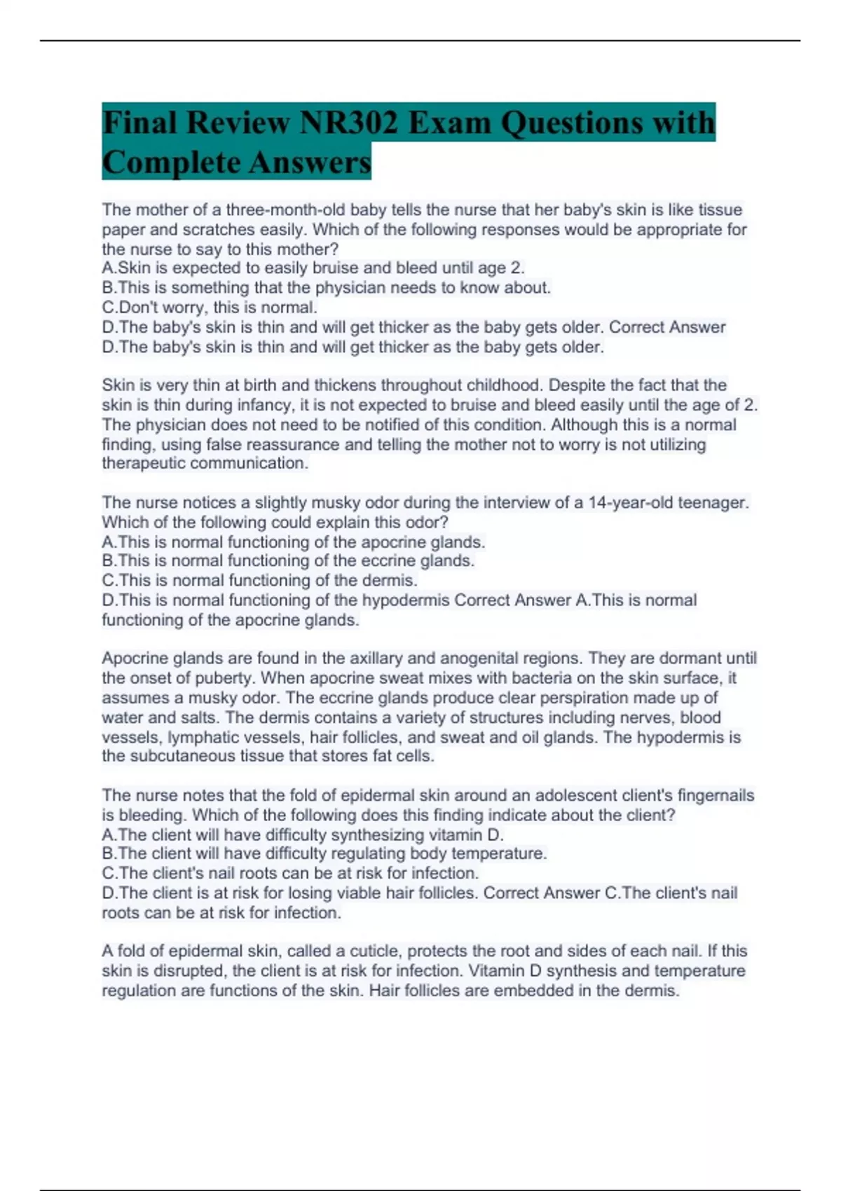 The mother of a three-month-old baby tells the nurse that her baby's skin is like tissue paper and scratches easily. Which of the following responses would be appropriate for the nurse to say to this mother? A.Skin is expected to easily bruise and bleed until age 2. B.This is something that the physician needs to know about. C.Don't worry, this is normal. D.The baby's skin is thin and will get thicker as the baby gets older. Correct Answer D.The baby's skin is thin and will get thicker as the baby gets older. Skin is very thin at birth and thickens throughout childhood. Despite the fact that the skin is thin during infancy, it is not expected to bruise and bleed easily until the age of 2. The physician does not need to be notified of this condition. Although this is a normal finding, using false reassurance and telling the mother not to worry is not utilizing therapeutic communication. The nurse notices a slightly musky odor during the interview of a 14-year-old teenager. Which of the following could explain this odor? A.This is normal functioning of the apocrine glands. B.This is normal functioning of the eccrine glands. C.This is normal functioning of the dermis. D.This is normal functioning of the hypodermis Correct Answer A.This is normal functioning of the apocrine glands. Apocrine glands are found in the axillary and anogenital regions. They are dormant until the onset of puberty. When apocrine sweat mixes with bacteria on the skin surface, it assumes a musky odor. The eccrine glands produce clear perspiration made up of water and salts. The dermis contains a variety of structures including nerves, blood vessels, lymphatic vessels, hair follicles, and sweat and oil glands. The hypodermis is the subcutaneous tissue that stores fat cells. The nurse notes that the fold of epidermal skin around an adolescent client's fingernails is bleeding. Which of the following does this finding indicate about the client? A.The client will have difficulty synthesizing vitamin D. B.The client will have difficulty regulating body temperature. C.The client's nail roots can be at risk for infection. D.The client is at risk for losing viable hair follicles. Correct Answer C.The client's nail roots can be at risk for infection. A fold of epidermal skin, called a cuticle, protects the root and sides of each nail. If this skin is disrupted, the client is at risk for infection. Vitamin D synthesis and temperature regulation are functions of the skin. Hair follicles are embedded in the dermis.