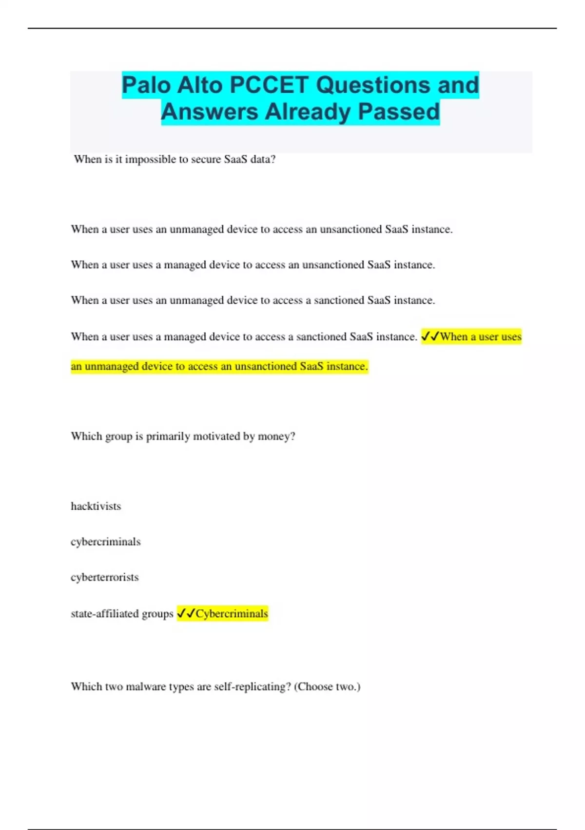 Palo Alto PCCET Questions and Answers Already Passed When is it impossible to secure SaaS data? When a user uses an unmanaged device to access an unsanctioned SaaS instance. When a user uses a managed device to access an unsanctioned SaaS instance. When a user uses an unmanaged device to access a sanctioned SaaS instance. When a user uses a managed device to access a sanctioned SaaS instance. When a user uses an unmanaged device to access an unsanctioned SaaS instance. Which group is primarily motivated by money? hacktivists cybercriminals cyberterrorists state-affiliated groups Cybercriminals Which two malware types are self-replicating? (Choose two.) logic bomb back door virus trojan horse worm Virus Worm Which type of attack includes an email advertisement for a dry cleaning service? spamming phishing spear phishing whaling Spamming Who is the most likely target of social engineering? Executive management, because it has the most permissions. Senior IT engineers, because the attacker hopes to get them to disable the security infrastructure. Junior people, because they are easier to stress and probably not as well trained. The accounting department, because it can wire money directly to the attacker's account. Junior people, because they are easier to stress and probably not as well trained. Which two attacks typically use a botnet? (Choose two.) Ssocial engineering DoS DDoS Sending spam to a lengthy mailing list Spear phishing DDoS Sending spam
