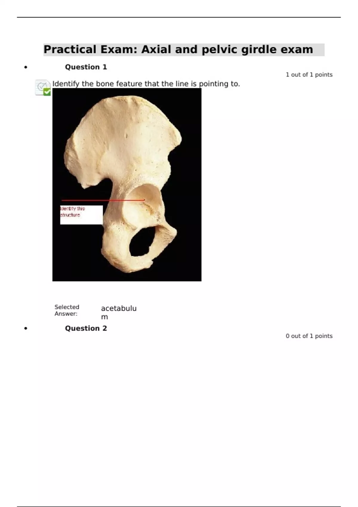 Practical Exam: Axial and pelvic girdle exam Question 1 1 out of 1 points Identify the bone feature that the line is pointing to. Selected Answer: acetabulu m Question 2 0 out of 1 points Identify this area of this bone. Selected Answer: lamin a Question 3
