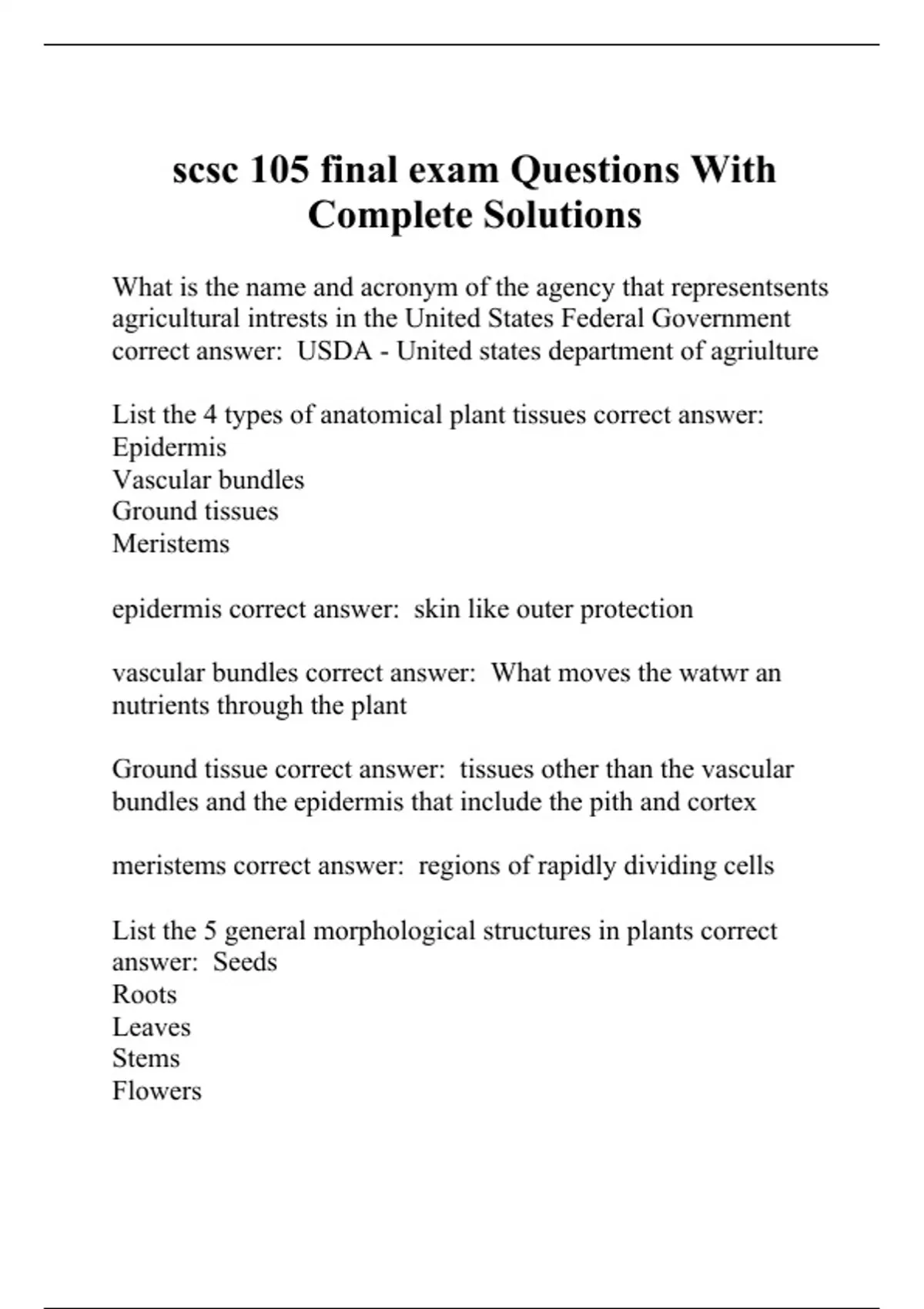What is the name and acronym of the agency that representsents agricultural intrests in the United States Federal Government correct answer: USDA - United states department of agriulture List the 4 types of anatomical plant tissues correct answer: Epidermis Vascular bundles Ground tissues Meristems epidermis correct answer: skin like outer protection vascular bundles correct answer: What moves the watwr an nutrients through the plant Ground tissue correct answer: tissues other than the vascular bundles and the epidermis that include the pith and cortex meristems correct answer: regions of rapidly dividing cells List the 5 general morphological structures in plants correct answer: Seeds Roots Leaves Stems Flowers Seeds correct answer: embryonic plant - result of reproduction roots correct answer: Absorbs water and minerals from the ground. Anchors plant in ground. leaves correct answer: The main photosynthetic organs of vascular plants. stems correct answer: supporting structures that connect roots and leaves, carrying water and nutrients between them flowers correct answer: reproductive part of the plant What is the difference between the anatomy and morphology of a plant? correct answer: anatomy is the study of internal tissue (what can't we see) Morphology is the study of the morpholo