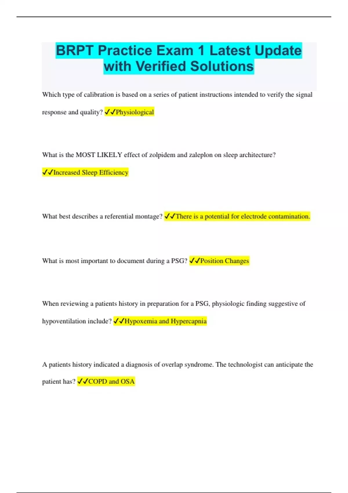 BRPT Practice Exam 1 Latest Update with Verified Solutions Which type of calibration is based on a series of patient instructions intended to verify the signal response and quality? Physiological What is the MOST LIKELY effect of zolpidem and zaleplon on sleep architecture? Increased Sleep Efficiency What best describes a referential montage? There is a potential for electrode contamination. What is most important to document during a PSG? Position Changes When reviewing a patients history in preparation for a PSG, physiologic finding suggestive of hypoventilation include? Hypoxemia and Hypercapnia A patients history indicated a diagnosis of overlap syndrome. The technologist can anticipate the patient has? COPD and OSA The syndrome characterized by prolonged episodes of severe hypoxemia and associated PaC02 elevation that worsens during sleep is? Obesity Hypoventilation The ability to remontage while recording on digital equipment is the result of? CMR "Common Mode Rejection" According to the recommended guidelines, the device that shold be used to monitor airflow and detect apnea during a PSG is? Oronasal Thermal Sensor Accoring to the recommended guidelines, what should be included when recording pediatric patients? End-Tidal C02 What is the most common method to monitor blood O2 saturation during a PSG? Pulse Oximetry What is the most important reason for performing a MWT? Measure the patients ability to resist the urge to fall asleep. When the amplitude of a signal exceeds the physical limitations of a channel the MOST important adjustment the technologist can make to optimize the waveform display is to? Decrease Sensitivity A self-reporting tool used to evaluate subjective sleep quality and disturbance over the previous month is? Pittsburgh Sleep Quality Index