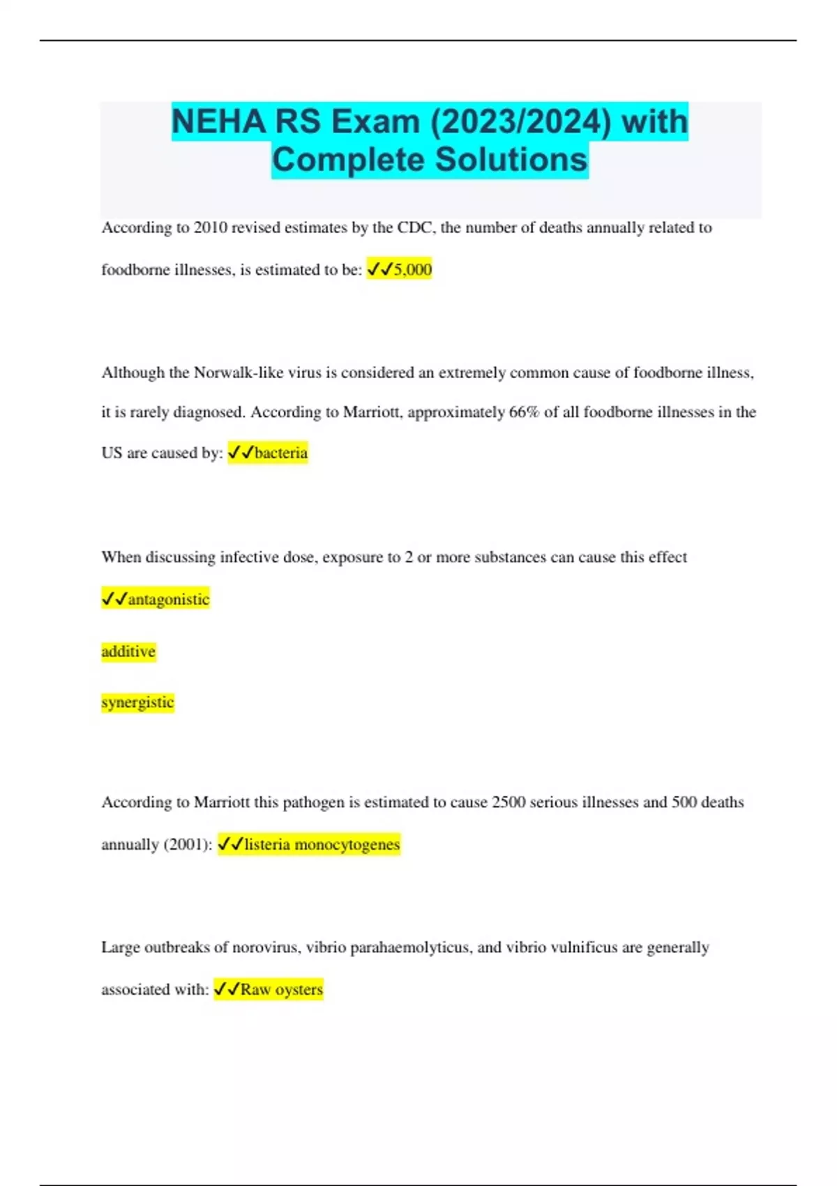 NEHA RS Exam (2023/2024) with Complete Solutions According to 2010 revised estimates by the CDC, the number of deaths annually related to foodborne illnesses, is estimated to be: 5,000 Although the Norwalk-like virus is considered an extremely common cause of foodborne illness, it is rarely diagnosed. According to Marriott, approximately 66% of all foodborne illnesses in the US are caused by: bacteria When discussing infective dose, exposure to 2 or more substances can cause this effect antagonistic additive synergistic According to Marriott this pathogen is estimated to cause 2500 serious illnesses and 500 deaths annually (2001): listeria monocytogenes Large outbreaks of norovirus, vibrio parahaemolyticus, and vibrio vulnificus are generally associated with: Raw oysters Incomplete cooking and cooling of stews, meats, gravies, and large cuts of meat that have been rolled or penetrated with skewers can lead to outbreaks of: Clostridium perfringins food poisoning Botulism, caused by C. Botulinum, is a hazard in prepared foods in which oxygen has been driven off in cooking and in which the food is shielded from oxygen and kept warm, permitting surviving spores to germinate and produce the deadly toxin. Which of the following is a possible example of this occurring? Meat pies Sautéed onions Garlic in olive oil In 1999 american journal implicated in a 10 to 19% of foodborne illness the US to Japan as 70% Seafood The development of illness is dependent on the following factor: The dose or amount of agent ingested The virulence of a substance The susceptibility of the individual Aflatoxins are associated with Mold Mercury poisoning in humans is has not been associated with the consumption of: Pasteurized milk Goiter is a thyroid disorder usually caused by a: Deficient iodine intake in the diet Kwashiorkor, common among children less than 6 years of age living in under developed areas of the world, is caused by a deficiency of: Protein The most common cause of animal infectious leading to contamination of meat and poultry is: Contaminated food Which of the foodborne disease has the most rapid time of onset following consumption of the food caontamination with this particular pathogen? Staphylococcal intoxications In regulations the word shall denotes? Requirement A microorganism that consists only of a single molecule of DNA or RNA surrounded by a protein coating is a: Virus Bacterial pathogens prefer a neutral pH, but these microorganisms can withstand a wider pH range of 2.0 to 8.0: Molds Which of the following have the highest water activity (Aw) requirements? Bacteria Substances or agents that inhibit microbial activity are called Bacteriostats According to Marriott and his discussion of HACCP, to prevent possible foodborne illness, hot potentially food shall be cooled to refrigeration temperatures within: Two to four hours Unlike salmonella and listeria which require an infective dose