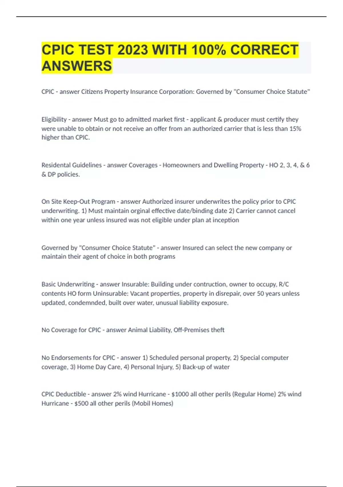 CPIC TEST 2023 WITH 100% CORRECT ANSWERS.