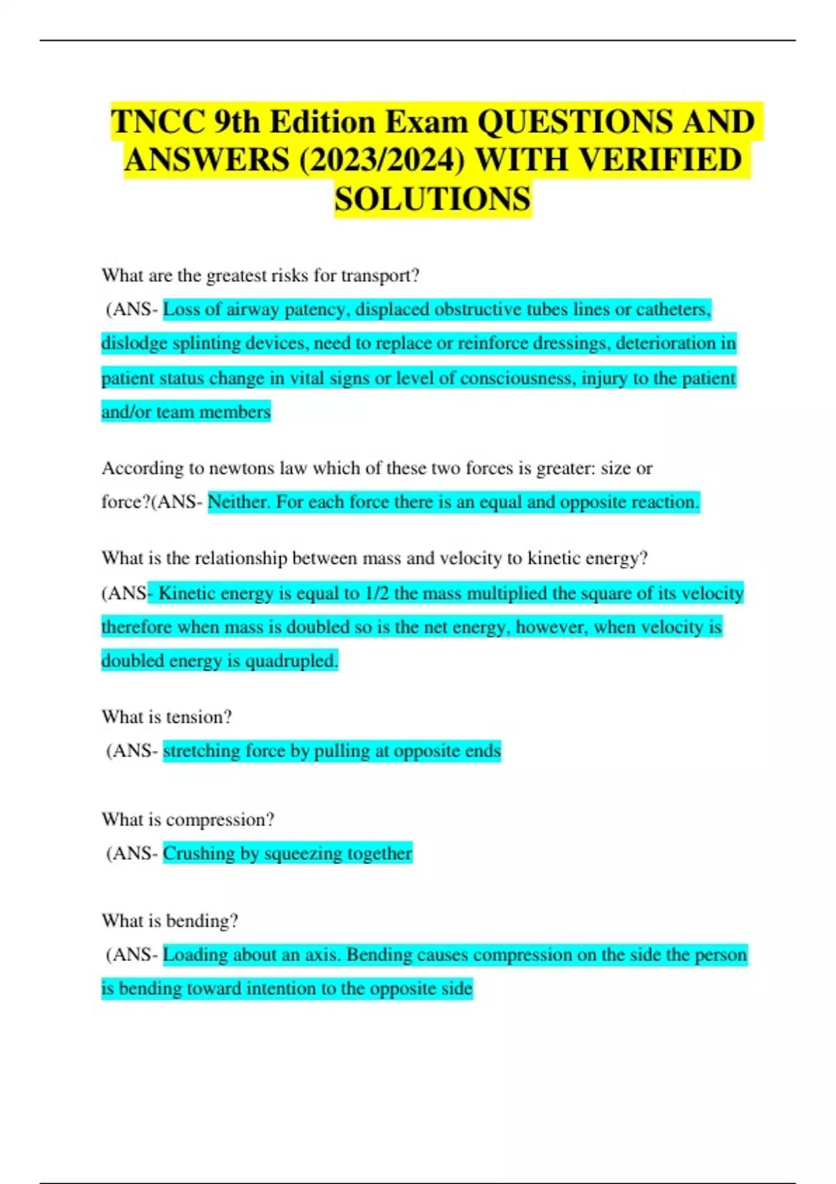 TNCC 9th Edition Exam QUESTIONS AND ANSWERS (2023/2024) WITH VERIFIED SOLUTIONS