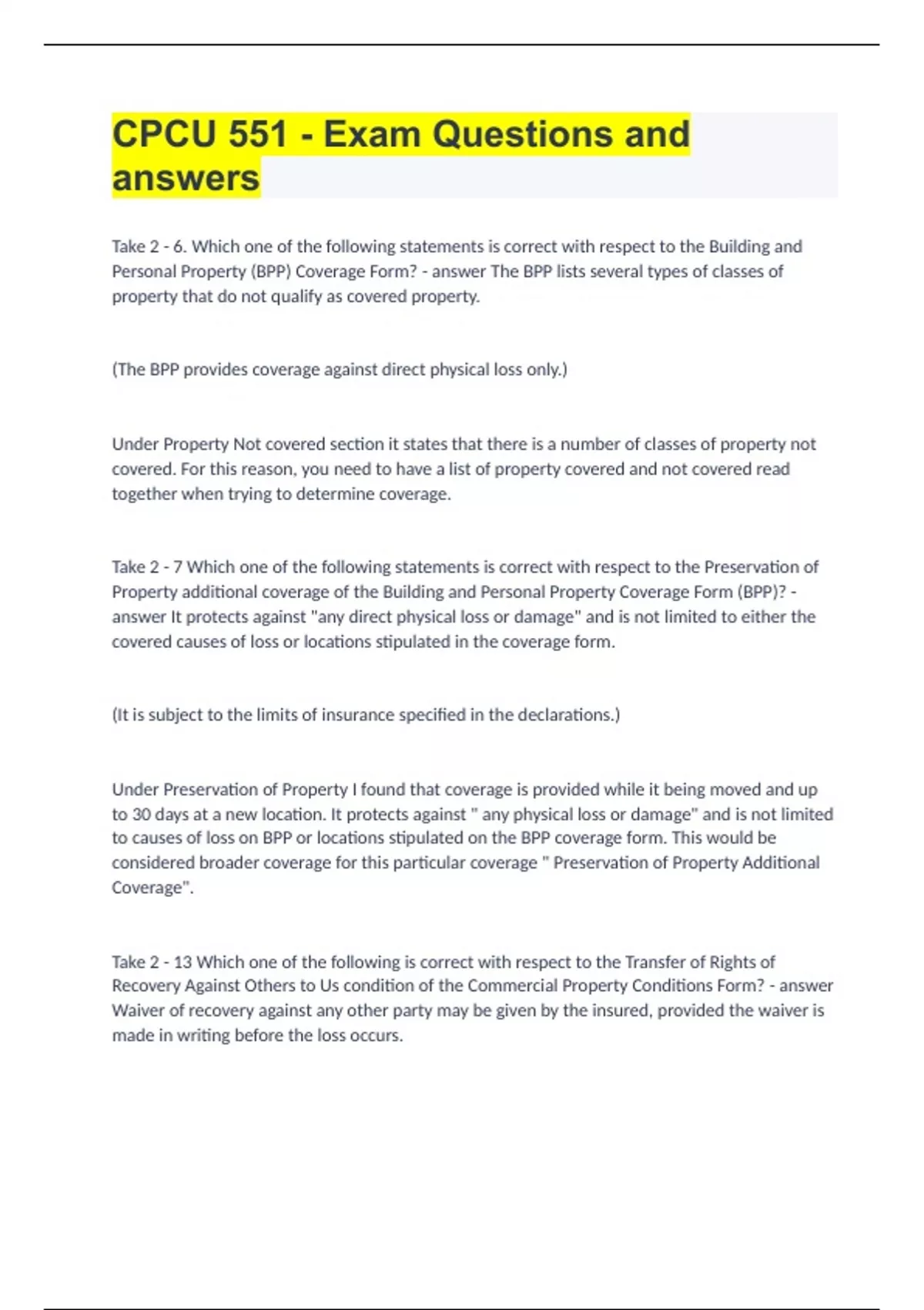 A HUGE BUNDLE FOR CPCU 551 EXAMS ALL WITH 100% CORRECT ANSWERS AND GRADED A+|UPDATED & VERIFIED 2023/24(DOWNLOAD TO PASS)