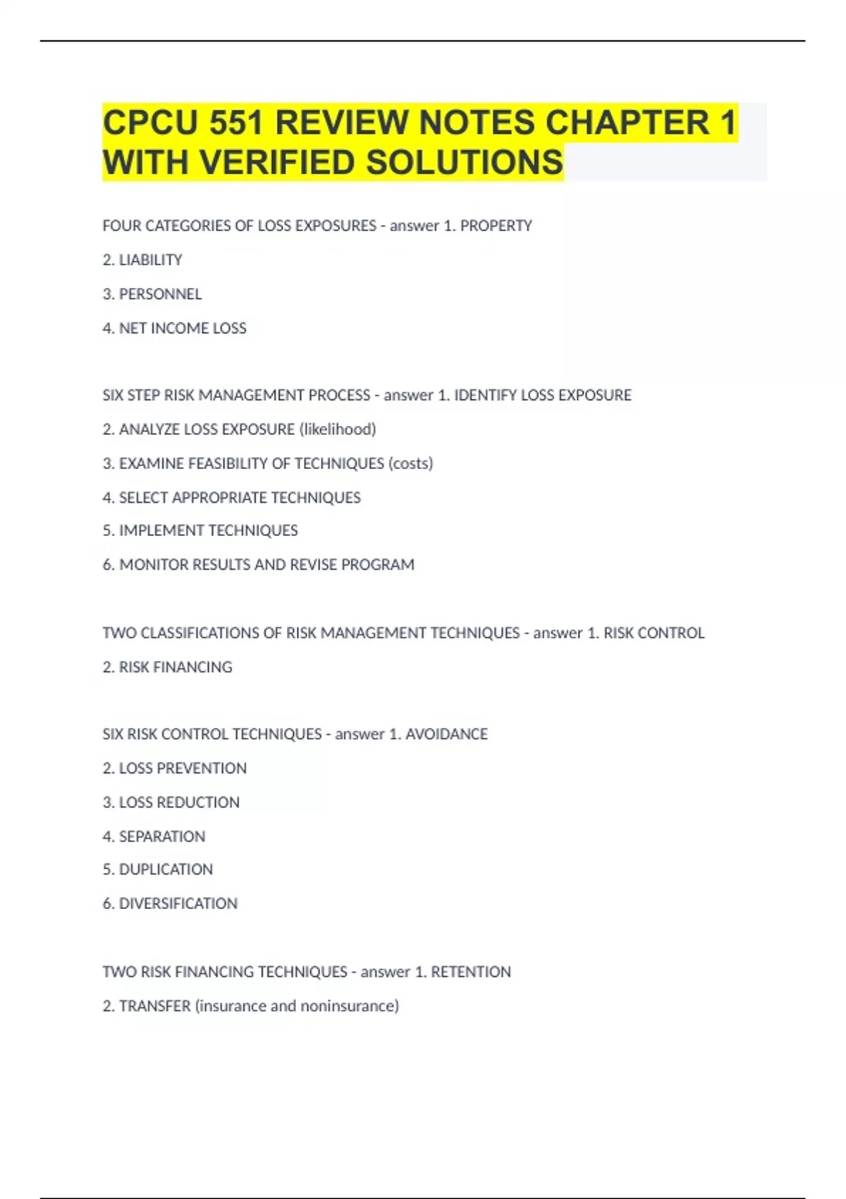 CPCU 551 REVIEW NOTES CHAPTER 1 WITH VERIFIED SOLUTIONS