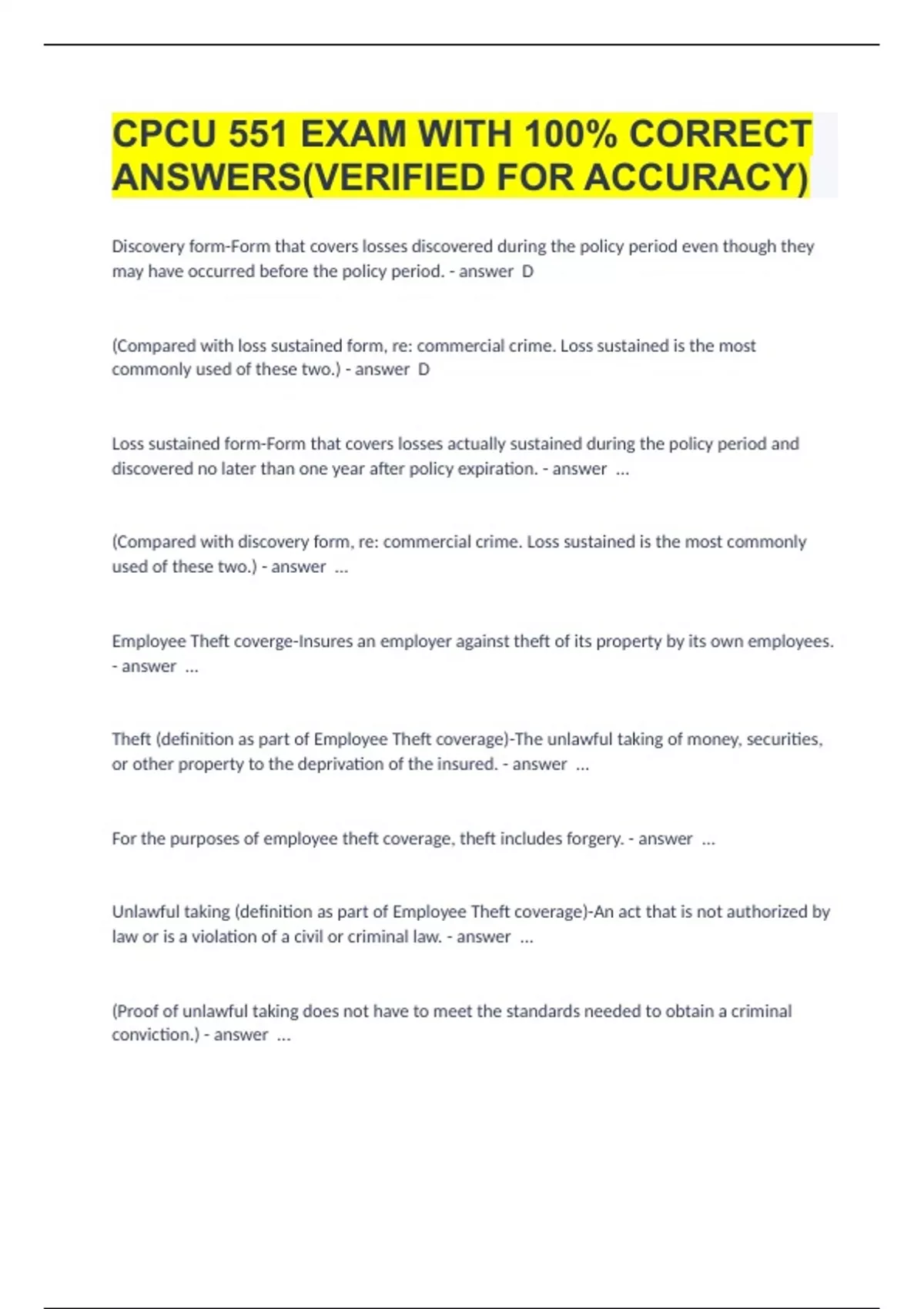 A HUGE BUNDLE FOR CPCU 551 EXAMS ALL WITH 100% CORRECT ANSWERS AND GRADED A+|UPDATED & VERIFIED 2023/24(DOWNLOAD TO PASS)