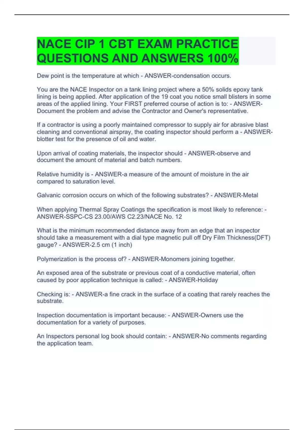 Dew point is the temperature at which - ANSWER-condensation occurs. You are the NACE Inspector on a tank lining project where a 50% solids epoxy tank lining is being applied. After application of the 19 coat you notice small blisters in some areas of the applied lining. Your FIRST preferred course of action is to: - ANSWER-Document the problem and advise the Contractor and Owner's representative. If a contractor is using a poorly maintained compressor to supply air for abrasive blast cleaning and conventional airspray, the coating inspector should perform a - ANSWER-blotter test for the presence of oil and water. Upon arrival of coating materials, the inspector should - ANSWER-observe and document the amount of material and batch numbers. Relative humidity is - ANSWER-a measure of the amount of moisture in the air compared to saturation level. Galvanic corrosion occurs on which of the following substrates? - ANSWER-Metal When applying Thermal Spray Coatings the specification is most likely to reference: - ANSWER-SSPC-CS 23.00/AWS C2.23/NACE No. 12 What is the minimum recommended distance away from an edge that an inspector should take a measurement with a dial type magnetic pull off Dry Film Thickness(DFT) gauge? - ANSWER-2.5 cm (1 inch) Polymerization is the process of? - ANSWER-Monomers joining together. An exposed area of the substrate or previous coat of a conductive material, often caused by poor application technique is called: - ANSWER-Holiday Checking is: - ANSWER-a fine crack in the surface of a coating that rarely reaches the substrate. Inspection documentation is important because: - ANSWER-Owners use the documentation for a variety of purposes. An Inspectors personal log book should contain: - ANSWER-No comments regarding the application team. You have just received your NACE CIP Level 1 certification when you are asked to supervise a team of uncertified field pipeline inspectors. Your FIRST preferred course of action is to: - ANSWER-Review the NACE Attestation prior to making a decision. Good record can provide maintenance departments with detailed information about ALL of the following EXCEPT: - ANSWER-How the item was coated. Non Conformance Reports are completed by the Inspector: - ANSWER-When the Inspector and Contractor deem it to be significant non conforming item. The initial steel condition is important to the NACE Inspector because: - ANSWER-The Inspector may have to reject the steel. The form of corrosion that has the largest potential for unexpected catastrophic failure is: - ANSWER-Galvanic Corrosion What is used to determine compressed air cleanliness? - ANSWER-Profilometer Osmotic blistering is most likely to occur as a result of: - ANSWER-Airless spray application. When performing tests for oil and grease using an ultra violet light, the NACE Inspector should be aware that: - ANSWER-Synthetic oil or grease may not be identified. To achieve consistently accurate results with ALL alt test equipment: - ANSWER-wash your hands before sampling. When holiday testing is required the Inspector is always required to enforce what standard? - ANSWER-NACE SP 0188 If the specifier does not identify a restriction level in accordance with SSPC PA 2, the default restriction level is: - ANSWER-Level 3 Fine cracks in the surface of a coating that rarely reach the substrate are called: - ANSWER-Checking It is good practice for the NACE Inspector to have instrument calibration certificates available: - ANSWER-At all times. In a non convertible coating the role of the primary solvent is to: - ANSWER-To control the evaporation rate. Removal of weld splatter is required: - ANSWER-When specifically identified in the owners specification.