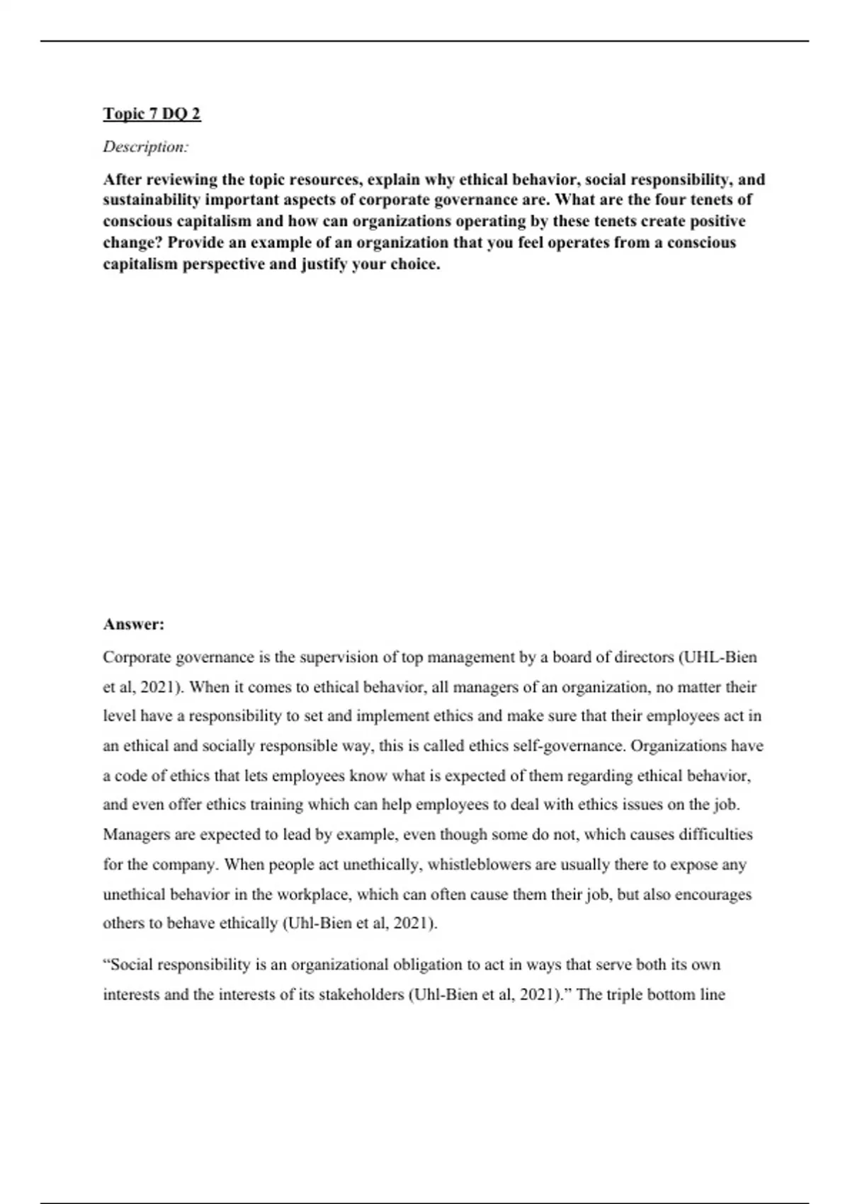 Topic 7 DQ 2 Description: After reviewing the topic resources, explain why ethical behavior, social responsibility, and sustainability important aspects of corporate governance are. What are the four tenets of conscious capitalism and how can organizations operating by these tenets create positive change? Provide an example of an organization that you feel operates from a conscious capitalism perspective and justify your choice.