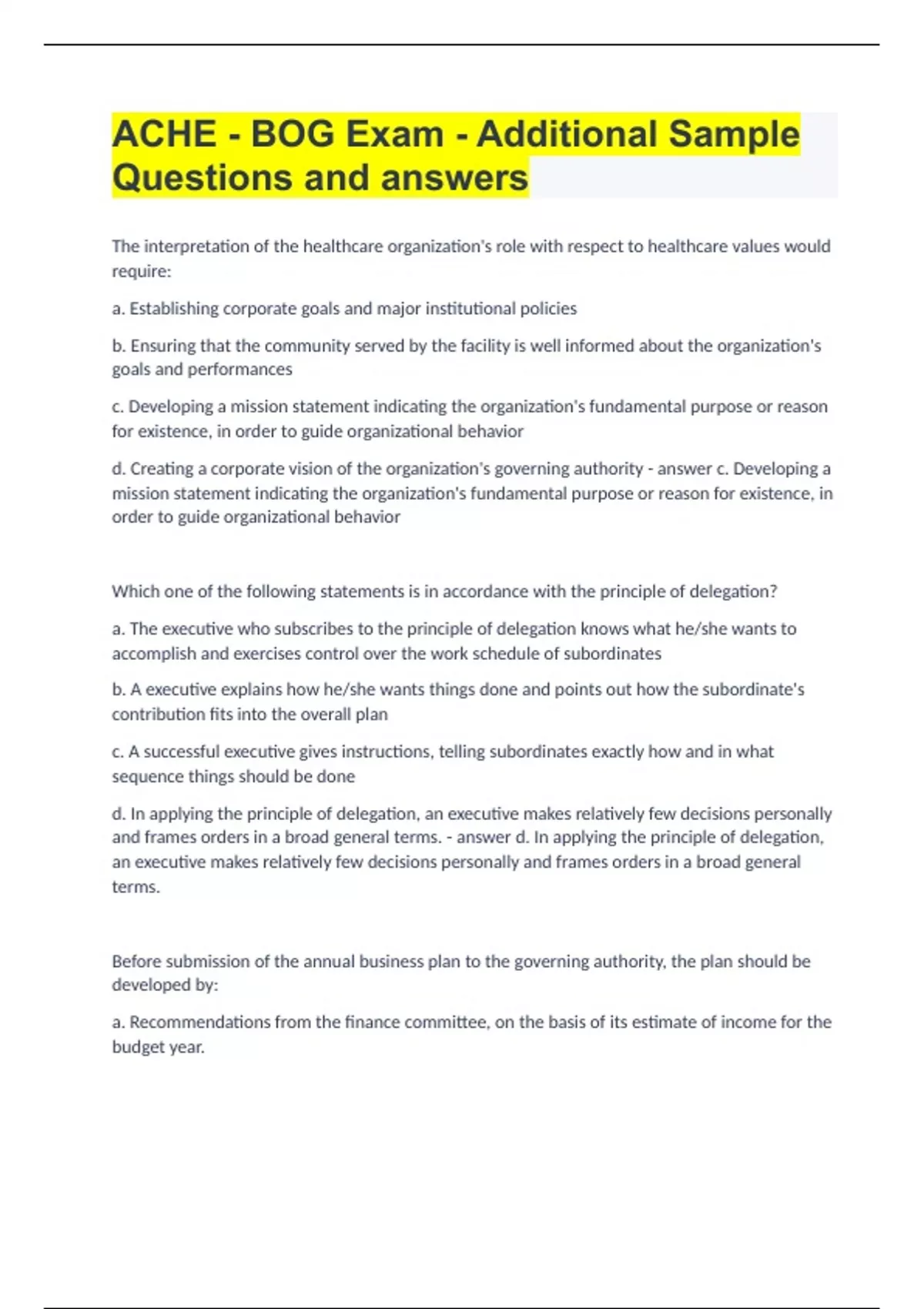 ACHE - BOG Exam - Additional Sample Questions and answers