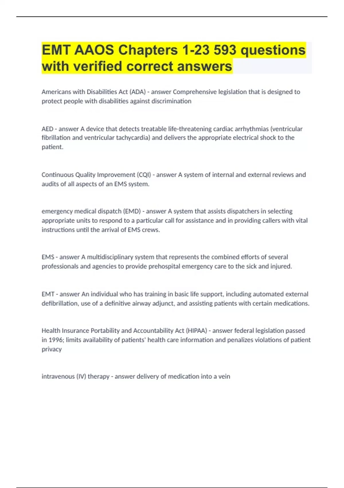 EMT AAOS Chapters 1-23|593 questions with verified correct answers.