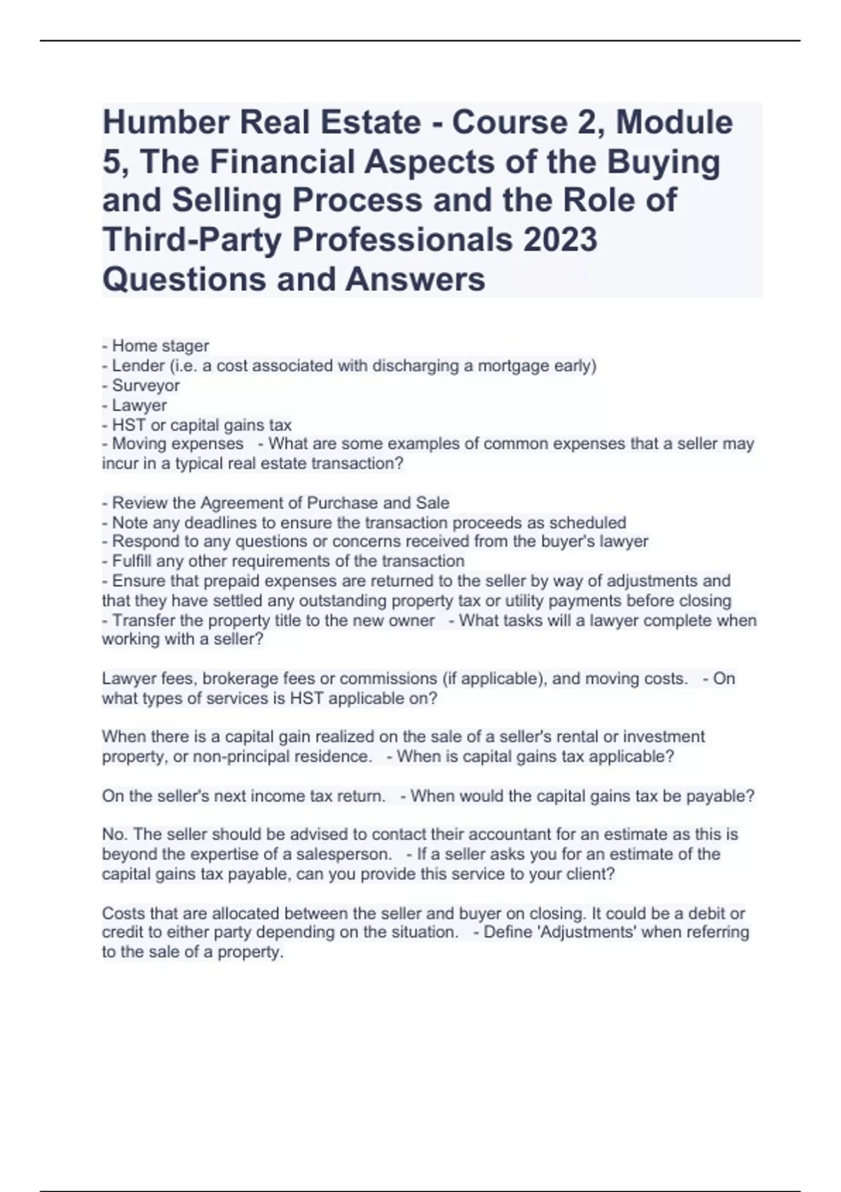 Humber Real Estate - Course 2, Module 5, The Financial Aspects of the Buying and Selling Process and the Role of Third-Party Professionals 2023 Questions and Answers