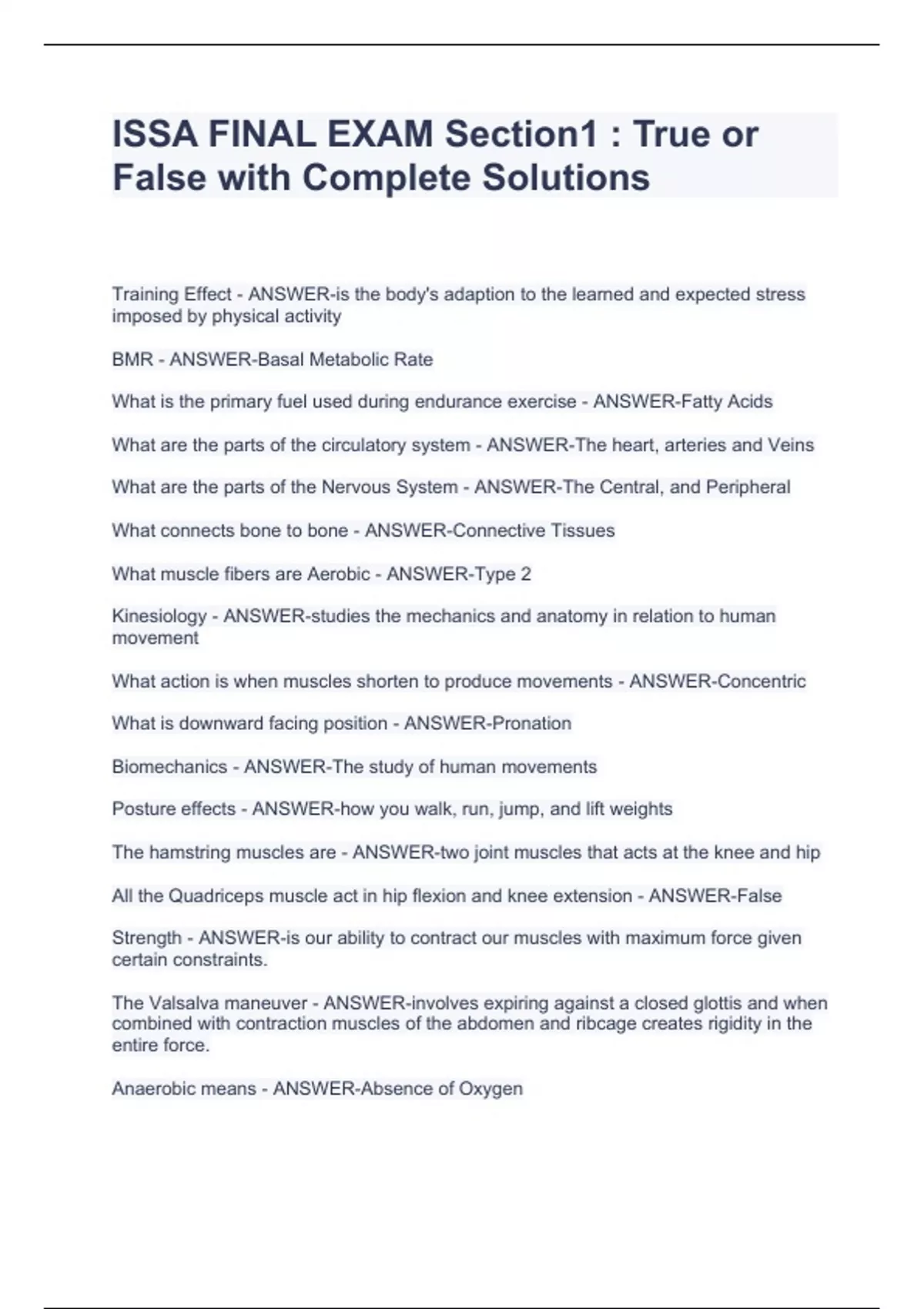 ISSA FINAL EXAM Section1 : True or False with Complete Solutions ISSA FINAL EXAM Section1 : True or False with Complete Solutions ISSA FINAL EXAM Section1 : True or False with Complete SolutionsTraining Effect - ANSWER-is the body's adaption to the learned and expected stress imposed by physical activity BMR - ANSWER-Basal Metabolic Rate What is the primary fuel used during endurance exercise - ANSWER-Fatty Acids