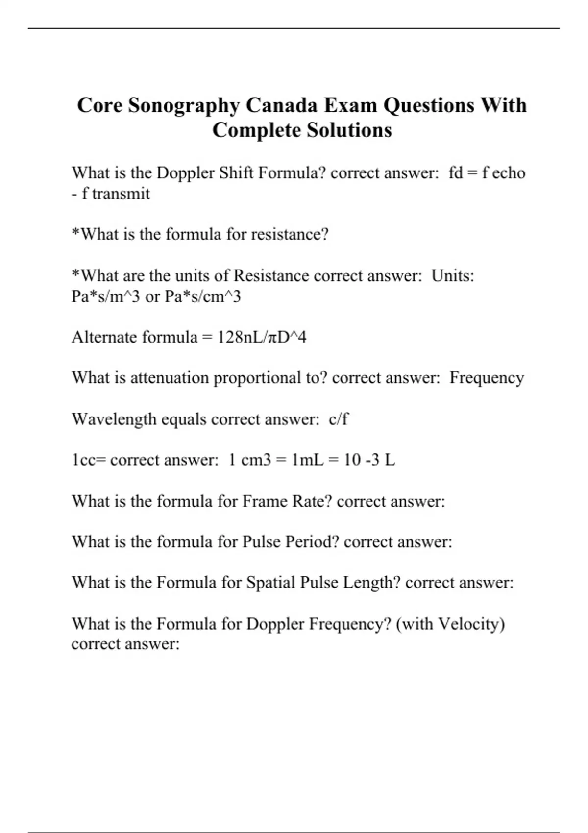 What is the Doppler Shift Formula? correct answer: fd = f echo - f transmit *What is the formula for resistance? *What are the units of Resistance correct answer: Units: Pa*s/m^3 or Pa*s/cm^3 Alternate formula = 128nL/πD^4 What is attenuation proportional to? correct answer: Frequency Wavelength equals correct answer: c/f 1cc= correct answer: 1 cm3 = 1mL = 10 -3 L What is the formula for Frame Rate? correct answer: What is the formula for Pulse Period? correct answer: What is the Formula for Spatial Pulse Length? correct answer: What is the Formula for Doppler Frequency? (with Velocity) correct answer: What is the formula for Velocity (for Doppler Imaging?) correct answer: What are some other versions of the Doppler Velocity Formula? correct answer: What is the formula for Pulse Repetition Frequency? correct answer: *What is Volume? *What are the Units of Volume? correct answer: *Volume is the amount of space the object occupies * CC = cm3, mL, L, mm3, oz, gallons, m3 *What is the formula for flow? *What law is this regarding? correct answer: Poiseuille's Law *What diseases are contact precautions? *What precautions are taken? correct answer: *CDiff, MRSA, Lice, Scabies, CPO, VRE *Gloves, gown, [face and eye protection as per risk assessment]. Hand hygiene. -Sign on door -Door may remain open. What diseases are Contact Plus? *What extra precautions are taken compared to regular contact? correct answer: *CDiff Same as contact except extra housecleaning *What diseases are Droplet? *What precautions are taken? correct answer: *Meningitis, mumps, pertussis (whooping cough). *Mask, eye protection, hand hygiene, -Sign on door. 2 m separation between patients. -Door can remain open.