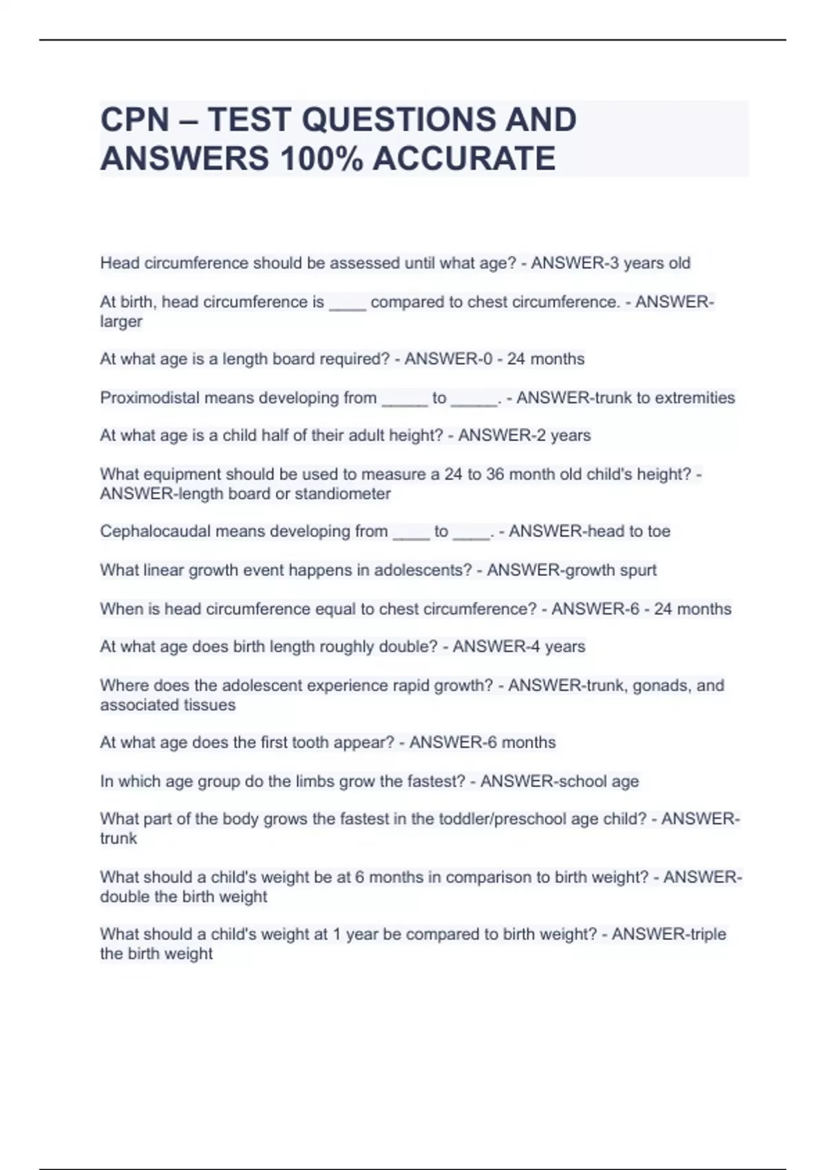 CPN – TEST QUESTIONS AND ANSWERS 100% ACCURATECPN – TEST QUESTIONS AND ANSWERS 100% ACCURATECPN – TEST QUESTIONS AND ANSWERS 100% ACCURATECPN – TEST QUESTIONS AND ANSWERS 100% ACCURATECPN – TEST QUESTIONS AND ANSWERS 100% ACCURATEHead circumference should be assessed until what age? - ANSWER-3 years old At birth, head circumference is ____ compared to chest circumference. - ANSWER-larger At what age is a length board required? - ANSWER-0 - 24 months Proximodistal means developing from _____ to _____. - ANSWER-trunk to extremities At what age is a child half of their adult height? - ANSWER-2 years What equipment should be used to measure a 24 to 36 month old child's height? - ANSWER-length board or standiometer Cephalocaudal means developing from ____ to ____. - ANSWER-head to toe What linear growth event happens in adolescents? - ANSWER-growth spurt When is head circumference equal to chest circumference? - ANSWER-6 - 24 months