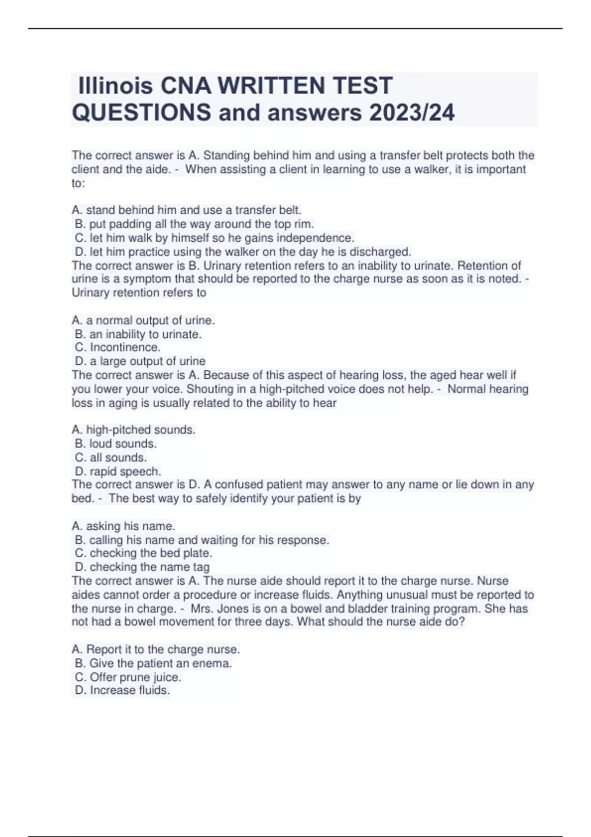Illinois CNA WRITTEN TEST QUESTIONS and answers 2023/24 The correct answer is A. Standing behind him and using a transfer belt protects both the client and the aide. - When assisting a client in learning to use a walker, it is important to: A. stand behind him and use a transfer belt. B. put padding all the way around the top rim. C. let him walk by himself so he gains independence. D. let him practice using the walker on the day he is discharged. The correct answer is B. Urinary retention refers to an inability to urinate. Retention of urine is a symptom that should be reported to the charge nurse as soon as it is noted. - Urinary retention refers to A. a normal output of urine. B. an inability to urinate. C. Incontinence. D. a large output of urine The correct answer is A. Because of this aspect of hearing loss, the aged hear well if you lower your voice. Shouting in a high-pitched voice does not help. - Normal hearing loss in aging is usually related to the ability to hear A. high-pitched sounds. B. loud sounds. C. all sounds. D. rapid speech. The correct answer is D. A confused patient may answer to any name or lie down in any bed. - The best way to safely identify your patient is by A. asking his name. B. calling his name and waiting for his response. C. checking the bed plate. D. checking the name tag The correct answer is A. The nurse aide should report it to the charge nurse. Nurse aides cannot order a procedure or increase fluids. Anything unusual must be reported to the nurse in charge. - Mrs. Jones is on a bowel and bladder training program. She has not had a bowel movement for three days. What should the nurse aide do? A. Report it to the charge nurse. B. Give the patient an enema. C. Offer prune juice. D. Increase fluids. The correct answer is C. The proper medical abbreviation for before meals is a.c. - The proper medical abbreviation for before meals is A. p.c. B. b.i.d. C. a.c. D. t.i.d. The correct answer is B. The proper medical term for high blood pressure is hypertension - The proper medical term for high blood pressure is A. diabetes. B. hypertension. C. hypotension. D. CVA. The correct answer is D. A mechanical soft diet is easy to chew, swallow, and digest. - A patient who has difficulty chewing or swallowing will need what type of diet? A. clear liquid B. low residue C. bland D. mechanical soft The correct answer is C. Helping her locate her room on her own would make Ms. Lee feel better about herself. - Mrs Smith is an 81-year-old resident with Alzheimer's disease and cannot find her room. What should the nurse aide do to help Mrs Smith feel more independent? A. Scold her and tell her to stay in the room. B. Ask her roommate to watch her. C. Place a familiar object outside her room door. D. Write the room number on a piece of paper. The correct answer is A. Input and output are totaled once per shift as well as every 24 hours - How often should a patient's intake and output records be totaled? A. once each shift B. twice a day C. every four hours D. every 12 hours The correct answer is C. Failure to notice bruises or marks on the skin on admission may later cause someone to believe you were involved in abuse. - Which of the following should you observe and record when admitting a client? A. color of the stool and amount of urine voided B. how much the client has eaten and drunk C. bruises, marks, rashes, or broken skin D. insur