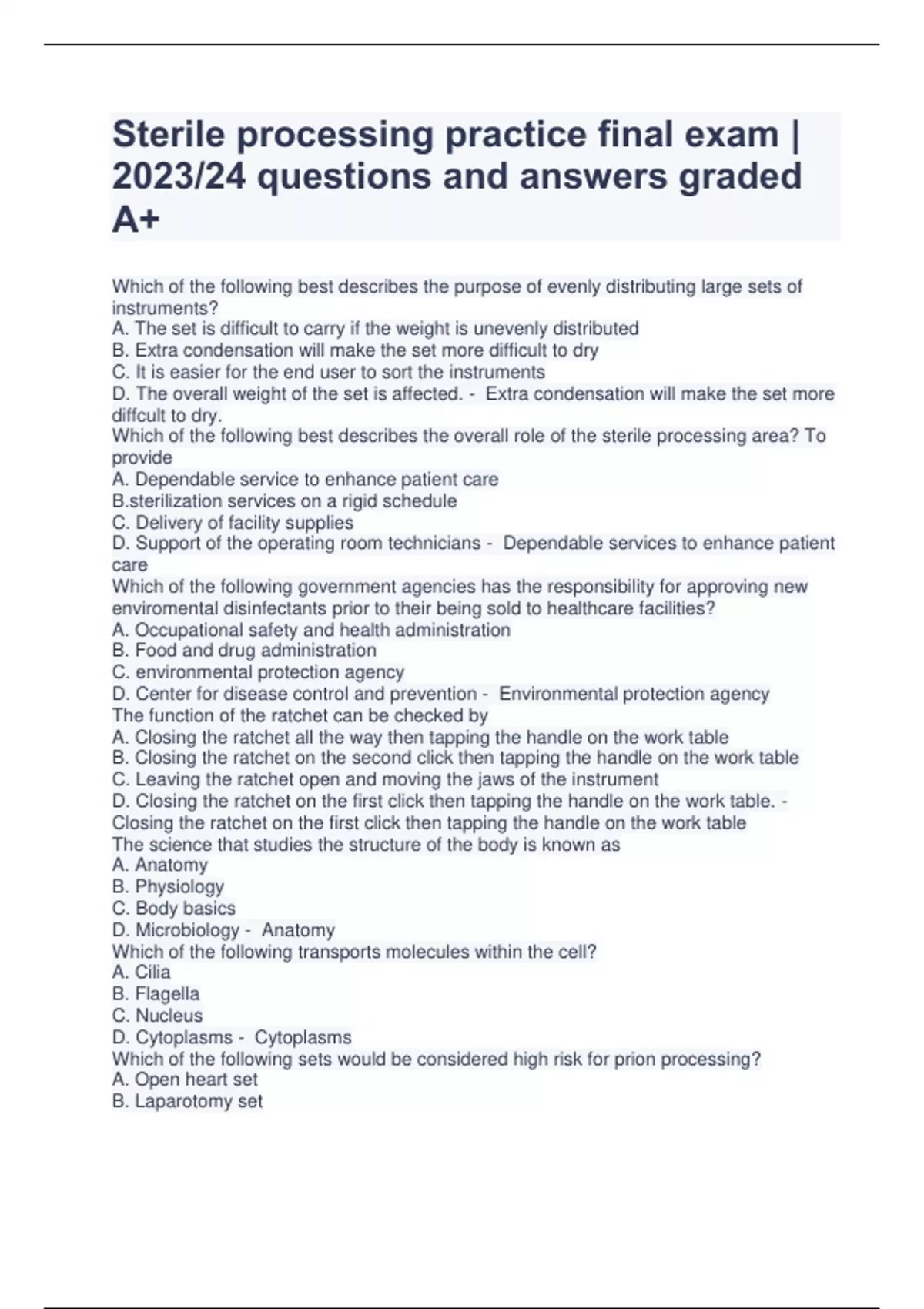 Sterile processing practice final exam | 2023/24 questions and answers graded A+ Which of the following best describes the purpose of evenly distributing large sets of instruments? A. The set is difficult to carry if the weight is unevenly distributed B. Extra condensation will make the set more difficult to dry C. It is easier for the end user to sort the instruments D. The overall weight of the set is affected. - Extra condensation will make the set more diffcult to dry. Which of the following best describes the overall role of the sterile processing area? To provide A. Dependable service to enhance patient care B.sterilization services on a rigid schedule C. Delivery of facility supplies D. Support of the operating room technicians - Dependable services to enhance patient care Which of the following government agencies has the responsibility for approving new enviromental disinfectants prior to their being sold to healthcare facilities? A. Occupational safety and health administration B. Food and drug administration C. environmental protection agency D. Center for disease control and prevention - Environmental protection agency The function of the ratchet can be checked by A. Closing the ratchet all the way then tapping the handle on the work table B. Closing the ratchet on the second click then tapping the handle on the work table C. Leaving the ratchet open and moving the jaws of the instrument D. Closing the ratchet on the first click then tapping the handle on the work table. - Closing the ratchet on the first click then tapping the handle on the work table The science that studies the structure of the body is known as A. Anatomy B. Physiology C. Body basics D. Microbiology - Anatomy Which of the following transports molecules within the cell? A. Cilia B. Flagella C. Nucleus D. Cytoplasms - Cytoplasms Which of the following sets would be considered high risk for prion processing? A. Open heart set B. Laparotomy set C. Abdominal set D. Craniotomy set - Craniotomy set The metacarpals are located in the ? A. Spine B. Feet C. Neck D. Hands - Hands Microorgansims are measured in A. Inches B. Microns C. Millimeters D. Centimeters - Microns with respect to rigid sterilization container testing; which terms define the sterilizers ability to sterilize under actual use conditions A. Routine biological testing B. Small load testing C. Chemical monitoring D. Maximum load testing - Maximum load testing if you have a fever your temp would be above A. 96.8 F (36C) B. 97.8 F (36.5C) C. 98.0F (36.7C) D. 98.6F (37C) - 98.6F (37c) Which of the following statements is true of a capsulated bacteria it is A. Less difficult to kill than Vegetative bacteria B. More difficult to kill than a spore C. More resistant to heat and chemicals D. Easily killed by antibotics - More resistant to heat and chemical Pulmonary capillaries are found in which system A. Endocrine B. Respiratory C. Nervous D. Digestive - Respiratory Ethics is the practice of A. Discussing patient issues with a friend? B. Not recognizing cultural beliefs C. Dealing with what is bad D. Doing the right thing - Doing the right thing A microorganisms that is resting and has a hard shell like outer covering is called a A. Prion B. Spore C. Flagella D. Capsule - Spore Spongiform encephalopathy is caused by which of the following A. Prions B. Spores C. Viruses D. Pyrogens - Prions Nails, tissues, and money are examples of A. Fomites B. Vehicles. C. Vectors D. Flagella - Fomites The Zika virus is transmitted by A. Droplets B. Vectors C. Direct contact D. Contaminated food and water - Vectors In the final step of hand washing the fingers should be rinsed with the fingertips A. Up B. Left C. Right D. Down - Up Waterless hand antiseptics contains what percentage concentration of alcohol to make them most effective A. 25% to 49% B. 60% to 95% C. 50% to 100% D. 75%to 100% - 60%to 95% All of the following play a role in how bones support other body systems except A. Storage of minerals B. Growth of blood cells C. Distribution of hormones D. Protection of internal organs - Distribution of hormones The occupational safety and health administration requires that transport containers for potentially infectious material be A. Leak proof B. Rubber C. Metal D. Glass - Leak proof Flagella help bacteria to A. Propel through liquid media B. Reproduce asexually C. Reproduce sexually D. Creat a thick hard shell - Propel through liquid medis The removal of contamination from an item to the extent necessary for further processing is called A. Sorting