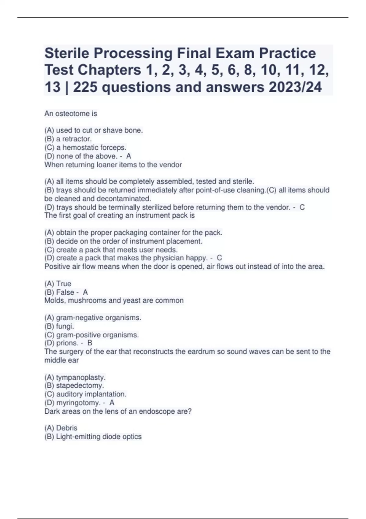 Sterile Processing Final Exam Practice Test Chapters 1, 2, 3, 4, 5, 6, 8, 10, 11, 12, 13 | 225 questions and answers 2023/24 An osteotome is (A) used to cut or shave bone. (B) a retractor. (C) a hemostatic forceps. (D) none of the above. - A When returning loaner items to the vendor (A) all items should be completely assembled, tested and sterile. (B) trays should be returned immediately after point-of-use cleaning.(C) all items should be cleaned and decontaminated. (D) trays should be terminally sterilized before returning them to the vendor. - C The first goal of creating an instrument pack is (A) obtain the proper packaging container for the pack. (B) decide on the order of instrument placement. (C) create a pack that meets user needs. (D) create a pack that makes the physician happy. - C Positive air flow means when the door is opened, air flows out instead of into the area. (A) True (B) False - A Molds, mushrooms and yeast are common (A) gram-negative organisms. (B) fungi. (C) gram-positive organisms. (D) prions. - B The surgery of the ear that reconstructs the eardrum so sound waves can be sent to the middle ear (A) tympanoplasty. (B) stapedectomy. (C) auditory implantation. (D) myringotomy. - A Dark areas on the lens of an endoscope are? (A) Debris (B) Light-emitting diode optics (C) Light-emitting diode bulbs (D) Damaged light fibers - D Soiled instruments and other items are received in the (blank) area of the Central Service department. (A) preparation (B) packaging (C) decontamination (D) sterilization - C Which of the following statements about the use of mechanical washers is NOT true? (A) Multi-level trays should be separated (B) Trays with lids should be opened (C) Instruments should be disassembled and opened (D) All items should be washed on the same cycle - D Agency which may intervene in a matter of worker protection even if there are no specific regulations covering the situation. (A) Occupational Safety and Health Administration (B) Environmental Protection Agency (C) U.S. Food and Drug Administration (D) Association of periOperative Registered Nurses - A Laser finished instruments are coated with durable protective finish that cannot be chipped or scratched. (A) True (B) False - B Healthcare-associated infections are (A) most likely to occur during a surgical procedure. (B) caused by drug resistant organisms. (C) those without known cures. (D) those which occur in the course of being treated in a healthcare facility. - D Viruses are larger than bacteria. (A) True (B) False - B The system that gives the body shape and support (A) muscular system. (B) nervous system. (C) skeletal system. (D) circulatory system. - C Electronic testing of laparoscopic insulation should be done (A) in the decontamination area prior to cleaning. (B) in the clean assembly area prior to set assembly. (C) at the factory or onsite repair unit. (D) in the operating room at the end of the procedure. - B Count sheets (A) describe each instrument in detail. (B) are used only for Operating Room trays and large procedure packs. (C) provide a detailed list of tray contents. (D) all the above. - C Central Service technicians must wear special attire referred to as (blank) to minimize their exposure to bloodborne pathogens and other contaminants. (A) PPE (B) OSHA (C) TPA (D) CDC - A The temperature in the decontamination area should be between (A) 55 to 60 degrees Fahrenheit (B) 58 to 62 degrees Fahrenheit (C) 60 to 65 degrees Fahrenheit (D) 65 to 70 degrees Fahrenheit - C Staphylococcus is classified as a gram-positive bacteria. (A) True (B) False - A Kerrison/laminectomy rongeurs should be tested using (A) tissue paper. (B) a plastic dowel rod. (C) rubber testing material. (D) an index card. - D Which of the following should be used to thoroughly rinse (remove) all traces of disinfectant from an endoscope's channels? (A) Forced air (B) Water containing approved sterilant (C) Treated water (D) A heated glutaraldehyde - C The prefix hemi- (A) means near. (B) is a suffix. (C) means half. (D) means around. - C The term septorhinoplasty means (A) surgery of a muscle wound. (B) surgical repair of the nose. (C) removal of a cyst. (D) incision of the stomach. - B Powered surgical instrument air hoses should be pressurized for proper inspection. (A) True (B) False - A Arthroscopy instruments are used during (A) robotic surgery. (B) laparoscopic surgery. (C) joint surgery. (D) all the above. - C The term itis means (A) illness. (B) inflammation. (C) study of. (D) pain. - B Bacteria that do not require oxygen to live are called (A) pathogenic. (B) anaerobic. (C) aerobic. (D) vibrio. - B Instruments (Scissors) with tungsten carbide jaws can be easily identified by (A) the diamond serration pattern on the instrument jaws. (B) the black handles on the instrument. (C) the gold handles on the instrument. (D) the self-retaining lock on the instrument shaft. - C Robotic instruments (A) do not come apart for cleaning. (B) have mechanical and electrical components in the proximal end of the instrument. (C) are heavier than standard laparoscopic instruments. (D) are all of the above. - D The mechanical process by which an ultrasonic cleaner works is called cavitation. (A) True (B) False - A Clean multi-part instruments that have been assembled to test for functionality should (A) remain assembled for sterilization. (B) be disassembled and placed in peel packs for sterilization. (C) be disassembled and sterilized following manufacturer's Instructions for Use. (D) broken down and place