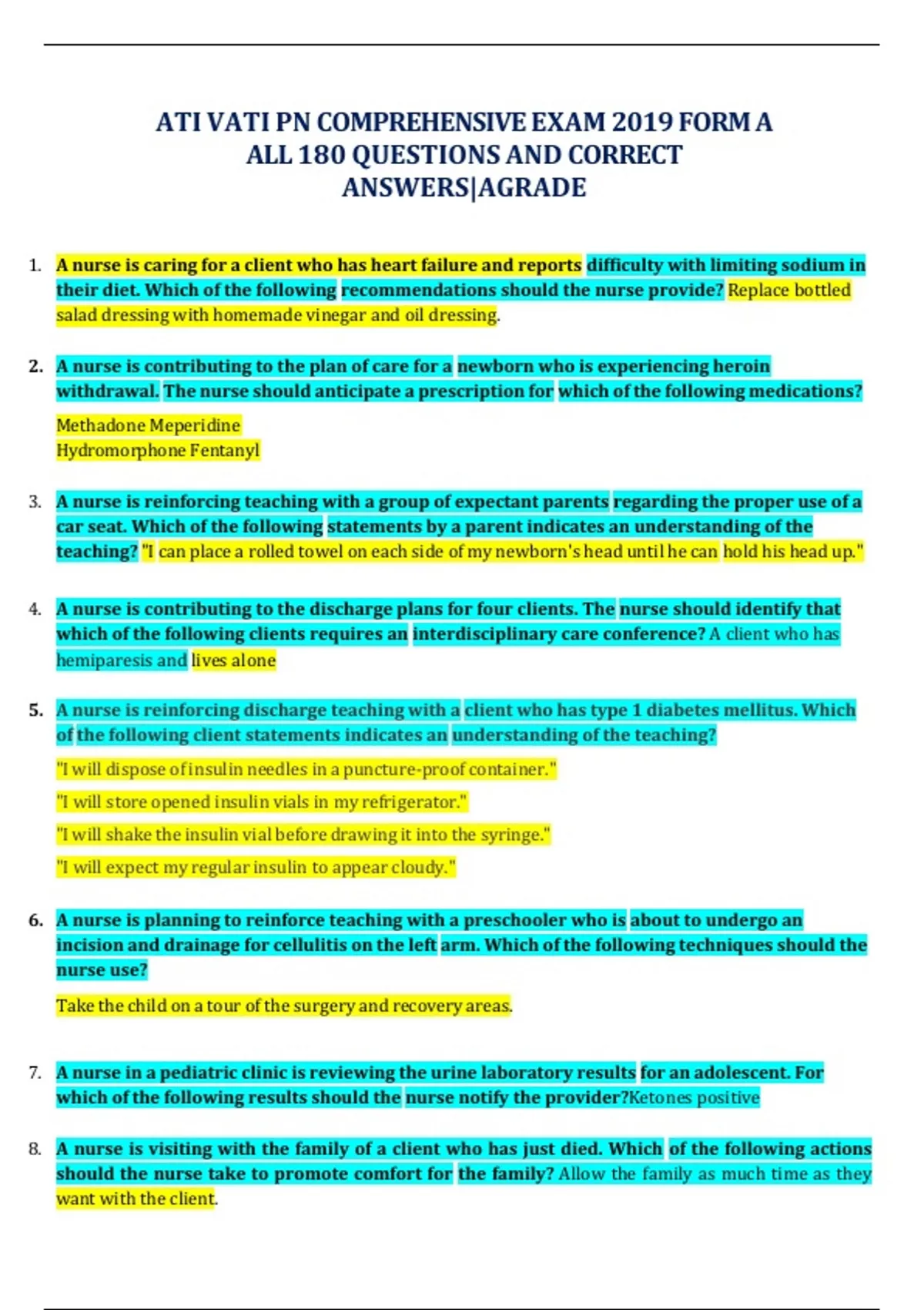 ATI VATI PN COMPREHENSIVE EXAM 2023 FORM A ALL 180 QUESTIONS AND CORRECT ANSWERS|AGRADE 1. A nurse is caring for a client who has heart failure and reports difficulty with limiting sodium in their diet. Which of the following recommendations should the nurse provide? Replace bottled salad dressing with homemade vinegar and oil dressing. 2. A nurse is contributing to the plan of care for a newborn who is experiencing heroin withdrawal. The nurse should anticipate a prescription for which of the following medications? Methadone Meperidine Hydromorphone Fentanyl 3. A nurse is reinforcing teaching with a group of expectant parents regarding the proper use of a car seat. Which of the following statements by a parent indicates an understanding of the teaching? "I can place a rolled towel on each side of my newborn's head until he can hold his head up." 4. A nurse is contributing to the discharge plans for four clients. The nurse should identify that which of the following clients requires an interdisciplinary care conference? A client who has hemiparesis and lives alone 5. A nurse is reinforcing discharge teaching with a client who has type 1 diabetes mellitus. Which of the following client statements indicates an understanding of the teaching? "I will dispose of insulin needles in a puncture-proof container." "I will store opened insulin vials in my refrigerator." "I will shake the insulin vial before drawing it into the syringe." "I will expect my regular insulin to appear cloudy." 6. A nurse is planning to reinforce teaching with a preschooler who is about to undergo an incision and drainage for cellulitis on the left arm. Which of the following techniques should the nurse use? Take the child on a tour of the surgery and recovery areas. 7. A nurse in a pediatric clinic is reviewing the urine laboratory results for an adolescent. For which of the following results should the nurse notify the provider?Ketones positive 8. A nurse is visiting with the family of a client who has just died. Which of the following actions should the nurse take to promote comfort for the family? Allow the family as much time as they want with the client. 9. A nurse on a maternal newborn unit is assisting with the preparation of an in-service presentation about infection control. Which of the following information should the nurse recommend to include?Visitors who have an upper respiratory infection should wear a mask. 10. A nurse is collecting data from a client who is postoperative and received hydromorphone 4 mg PO 15 min ago. The client tells the nurse, "My pain level is still 8 on a 0 to 10 scale." Which of the following actions should the nurse take first? Reevaluate the client's response to the medication in 30 min. 11. A nurse in a provider's office is reinforcing teaching with the parents of a school-age child who has an active case of Pediculosis humanus capitis. Which of the following should the nurse include in the teaching? Wash the bed linens in hot water. 12. A nurse from a medical-surgical unit is floating to a postpartum unit. Which of the following clients is an appropriate assignment for the nurse to accept? A client who had a cesarean delivery 24 hr ago 13. A nurse is assisting with the care of a client who is in active labor. Which of the following data is the priority for the nurse to collect following an amniotomy?Fetal heart rate 14. A nurse is assisting in the preparation of an in-service for a group of unit nurses about ethical principles. Which of the following nursing actions should the nurse include as an example of fidelity? A nurse keeps a promise made to a client. 15. A nurse is contributing to the plan of care for a 12-month-old infant following cleft palate repair. Which of the following actions should the nurse include? Maintain elbow restraints on the infant. 16. A nurse administered an IM injection to a client. Which of the following actions should the nurse take to reduce the risk of a needlestick injury? Dispose of the used needle immediately in a sharps container. 17. A nurse is collecting data from a client who has hepatitis A. Whichof the following findings should the nurse expect Abdominal pain 18. A nurse is reinforcing teaching with a client about caring for a new colostomy. Which of the following statements should the nurse make? "You should empty the colostomy bag when it is three-fourths full." 19. A charge nurse is explaining the role of a licensed practical nurse to an assistive personnel (AP). Which of the following responsibilities should the charge nurse include? Assessing a client's health status 20. A nurse is assisting with the admission of a client who has mononucleosis. Which of the following isolation precautions should the nurs