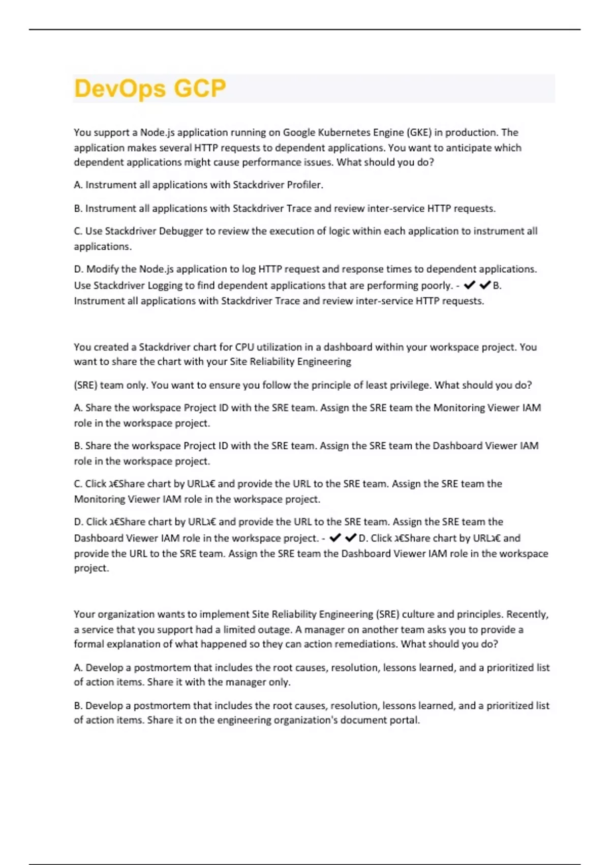 You support a N application running on Google Kubernetes Engine (GKE) in production. The application makes several HTTP requests to dependent applications. You want to anticipate which dependent applications might cause performance issues. What should you do? A. Instrument all applications with Stackdriver Profiler. B. Instrument all applications with Stackdriver Trace and review inter-service HTTP requests. C. Use Stackdriver Debugger to review the execution of logic within each application to instrument all applications. D. Modify the N application to log HTTP request and response times to dependent applications. Use Stackdriver Logging to find dependent applications that are performing poorly. - B. Instrument all applications with Stackdriver Trace and review inter-service HTTP requests. You created a Stackdriver chart for CPU utilization in a dashboard within your workspace project. You want to share the chart with your Site Reliability Engineering (SRE) team only. You want to ensure you follow the principle of least privilege. What should you do? A. Share the workspace Project ID with the SRE team. Assign the SRE team the Monitoring Viewer IAM role in the workspace project. B. Share the workspace Project ID with the SRE team. Assign the SRE team the Dashboard Viewer IAM role in the workspace project. C. Click €גShare chart by URL €גand provide the URL to the SRE team. Assign the SRE team the Monitoring Viewer IAM role in the workspace project. D. Click €גShare chart by URL €גand provide the URL to the SRE team. Assign the SRE team the Dashboard Viewer IAM role in the workspace project. - D. Click €גShare chart by URL €גand provide the URL to the SRE team. Assign the SRE team the Dashboard Viewer IAM role in the workspace project. Your organization wants to implement Site Reliability Engineering (SRE) culture and principles. Recently, a service that you support had a limited outage. A manager on another team asks you to provide a formal explanation of what happened so they can action remediations. What should you do? A. Develop a postmortem that includes the root causes, resolution, lessons learned, and a prioritized list of action items. Share it with the manager only. B. Develop a postmortem that includes the root causes, resolution, lessons learned, and a prioritized list of action items. Share it on the engineering organization's document portal.C. Develop a postmortem that includes the root causes, resolution, lessons learned, the list of people responsible, and a list of action items for each person. Share it with the manager only. D. Develop a postmortem that includes the root causes, resolution, lessons learned, the list of people responsible, and a list of action items for each person. Share it on the engineering organization's document portal. - B. Develop a postmortem that includes the root causes, resolution, lessons learned, and a prioritized list of action items. Share it on the engineering organization's document portal. You have a set of applications running on a Google Kubernetes Engine (GKE) cluster, and you are using Stackdriver Kubernetes Engine Monitoring. You are bringing a new containerized application required by your company into production. This application is written by a third party and cannot be modified or reconfigured. The application writes its log information to /var/log/app_, and you want to send these log entries to Stackdriver Logging. What should you do? A. Use the default Stackdriver Kubernetes Engine Monitoring agent configuration. B. Deploy a Fluentd daemonset to GKE. Then create a customized input and output configuration to tail the log file in the application's pods and write to Stackdriver Logging. C. Install Kubernetes on Google Compute Engine (GCE) and redeploy your applications. Then customize the built-in Stackdriver Logging configuration to tail the log file in the application's pods and write to Stackdriver Logging. D. Write a script to tail the log file within the pod and write entries to standard output. Run the script as a sidecar container with the application's pod. Configure a shared volume between the containers to allow the script to have read access to /var/log in the application container. - B. Deploy a Fluentd daemonset to GKE. Then create a customized input and output configuration to tail the log file in the application's pods and write to Stackdriver Logging.