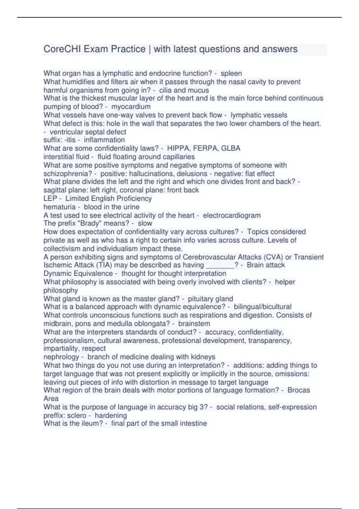 CoreCHI Exam Practice | with latest questions and answers What organ has a lymphatic and endocrine function? - spleen What humidifies and filters air when it passes through the nasal cavity to prevent harmful organisms from going in? - cilia and mucus What is the thickest muscular layer of the heart and is the main force behind continuous pumping of blood? - myocardium What vessels have one-way valves to prevent back flow - lymphatic vessels What defect is this: hole in the wall that separates the two lower chambers of the heart. - ventricular septal defect suffix: -itis - inflammation What are some confidentiality laws? - HIPPA, FERPA, GLBA interstitial fluid - fluid floating around capillaries What are some positive symptoms and negative symptoms of someone with schizophrenia? - positive: hallucinations, delusions - negative: flat effect What plane divides the left and the right and which one divides front and back? - sagittal plane: left right, coronal plane: front back LEP - Limited English Proficiency hematuria - blood in the urine A test used to see electrical activity of the heart - electrocardiogram The prefix "Brady" means? - slow How does expectation of confidentiality vary across cultures? - Topics considered private as well as who has a right to certain info varies across culture. Levels of collectivism and individualism impact these. A person exhibiting signs and symptoms of Cerebrovascular Attacks (CVA) or Transient Ischemic Attack (TIA) may be described as having _______? - Brain attack Dynamic Equivalence - thought for thought interpretation What philosophy is associated with being overly involved with clients? - helper philosophy What gland is known as the master gland? - pituitary gland What is a balanced approach with dynamic equivalence? - bilingual/bicultural What controls unconscious functions such as respirations and digestion. Consists of midbrain, pons and medulla oblongata? - brainstem What are the interpreters standards of conduct? - accuracy, confidentiality, professionalism, cultural awareness, professional development, transparency, impartiality, respect nephrology - branch of medicine dealing with kidneys What two things do you not use during an interpretation? - additions: adding things to target language that was not present explicitly or implicitly in the source, omissions: leaving out pieces of info with distortion in message to target language What region of the brain deals with motor portions of language formation? - Brocas Area What is the purpose of language in accuracy big 3? - social relations, self-expression preffix: sclero - hardening What is the ileum? - final part of the small intestine The ______ Model