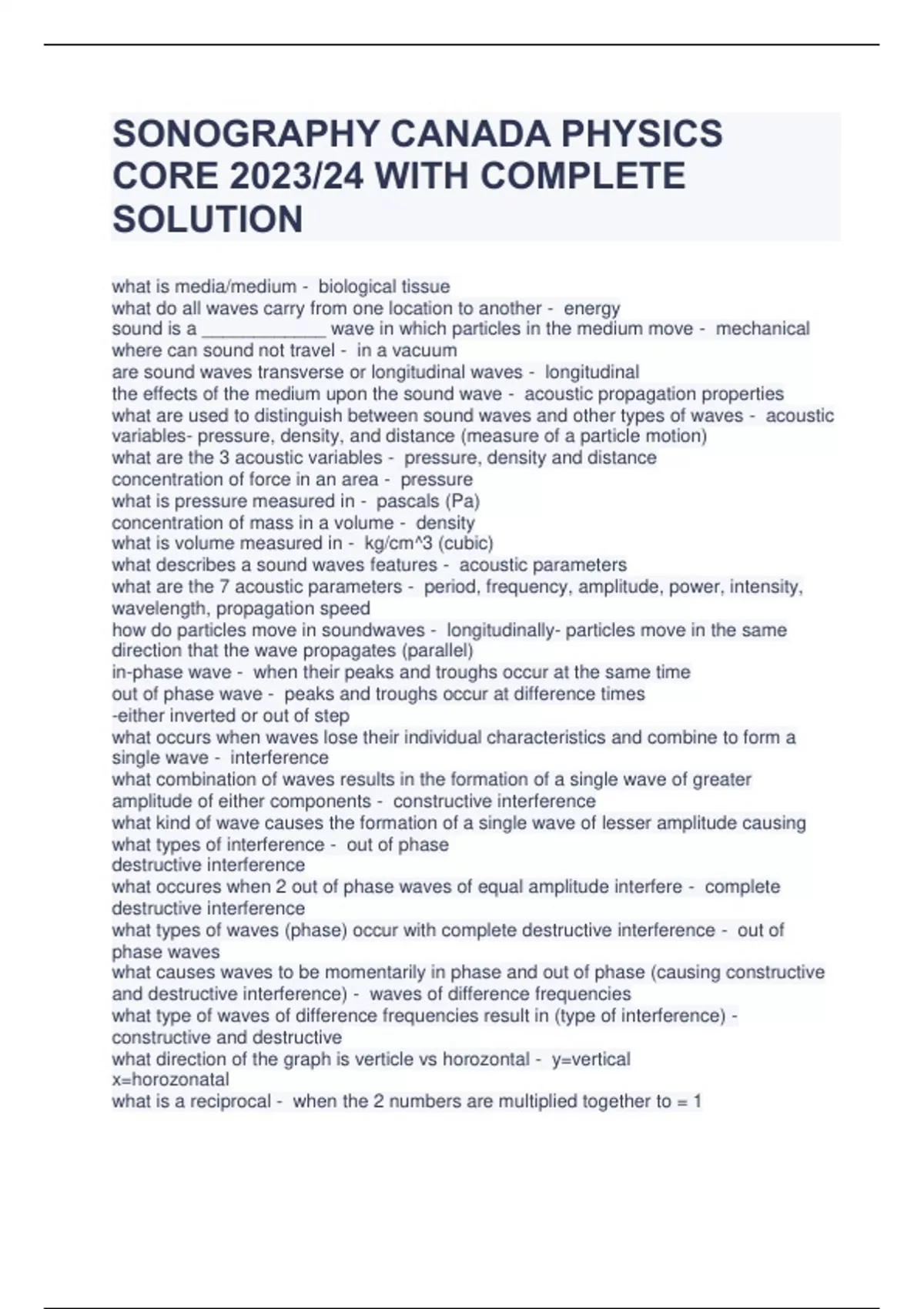 SONOGRAPHY CANADA PHYSICS CORE 2023/24 WITH COMPLETE SOLUTION what is media/medium - biological tissue what do all waves carry from one location to another - energy sound is a ____________ wave in which particles in the medium move - mechanical where can sound not travel - in a vacuum are sound waves transverse or longitudinal waves - longitudinal the effects of the medium upon the sound wave - acoustic propagation properties what are used to distinguish between sound waves and other types of waves - acoustic variables- pressure, density, and distance (measure of a particle motion) what are the 3 acoustic variables - pressure, density and distance concentration of force in an area - pressure what is pressure measured in - pascals (Pa) concentration of mass in a volume - density what is volume measured in - kg/cm^3 (cubic) what describes a sound waves features - acoustic parameters what are the 7 acoustic parameters - period, frequency, amplitude, power, intensity, wavelength, propagation speed how do particles move in soundwaves - longitudinally- particles move in the same direction that the wave propagates (parallel) in-phase wave - when their peaks and troughs occur at the same time out of phase wave - peaks and troughs occur at difference times -either inverted or out of step what occurs when waves lose their individual characteristics and combine to form a single wave - interference what combination of waves results in the formation of a single wave of greater amplitude of either components - constructive interference what kind of wave causes the formation of a single wave of lesser amplitude causing what types of interference - out of phase destructive interference what occures when 2 out of phase waves of equal amplitude interfere - complete destructive interference what types of waves (phase) occur with complete destructive interference - out of phase waves what causes waves to be momentarily in phase and out of phase (causing constructive and destructive interference) - waves of difference frequencies what type of waves of difference frequencies result in (type of interference) - constructive and destructive what direction of the graph is verticle vs horozontal - y=vertical x=horozonatal what is a reciprocal - when the 2 numbers are multiplied together to = 1 (10 x 1/10) tracy gets made king huge dense dummy cause millions (of) micro nuisances pileup - tera (10^12) giga (10^9) mega (10^6) kilo (10^3) hecto (10^2) deca (10^1) deci (-1) centi (-2) milli (-3) micro (-6) nano (-9) pico (-12) hertz to mega hertz - 1 000 000 > 1 what do parameters describe - the features of a sound wave. 7 parameters are required to ompletely characterize a sound wave which 2 parameters are reciprocals - period and frequency which parameters describe a waves bigness - amplitude, power, intensity which parameter is determined by the sound source and the medium - wavelength which parameters are determined by the sound source - period, frequency, amplitude, power, and intensity which parameter is determined by the medium - speed what is the time it takes a wave to vibrate a single cycle or the time from the start of one cycle to the start of the next cycle - period what units is the period reported in - time; microseconds, seconds what are the typical values of period in diagnostic US - 0.06-0.5microseconds 0..0000005 (ms) what is period determined by - sound source only can the sonographer adjust period - no what is the number of particular events that occur in a specific duration of time - frequency in US, what event is counted in frequency - number of cycles what units is frequency reported in - unit per second hertz/Hz, Hertz what are the ty