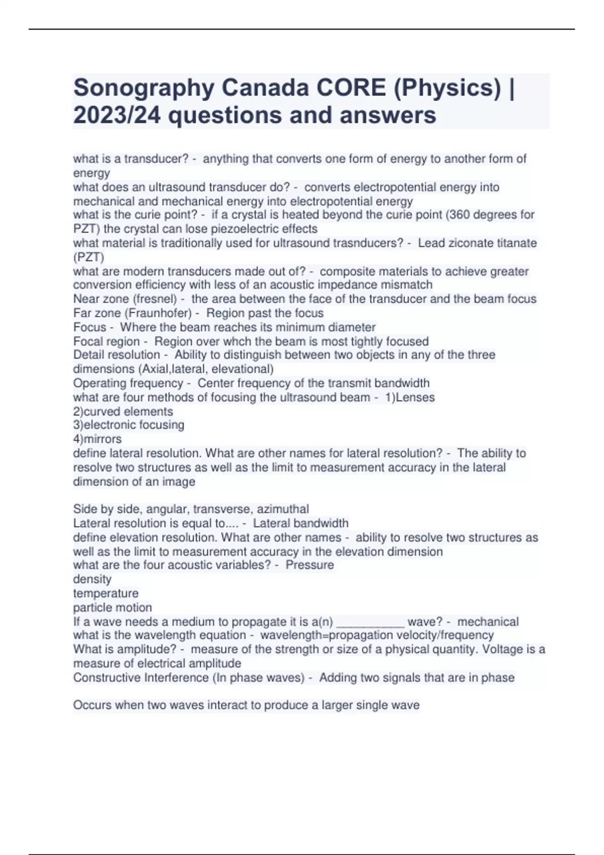 Sonography Canada CORE (Physics) | 2023/24 questions and answers what is a transducer? - anything that converts one form of energy to another form of energy what does an ultrasound transducer do? - converts electropotential energy into mechanical and mechanical energy into electropotential energy what is the curie point? - if a crystal is heated beyond the curie point (360 degrees for PZT) the crystal can lose piezoelectric effects what material is traditionally used for ultrasound trasnducers? - Lead ziconate titanate (PZT) what are modern transducers made out of? - composite materials to achieve greater conversion efficiency with less of an acoustic impedance mismatch Near zone (fresnel) - the area between the face of the transducer and the beam focus Far zone (Fraunhofer) - Region past the focus Focus - Where the beam reaches its minimum diameter Focal region - Region over whch the beam is most tightly focused Detail resolution - Ability to distinguish between two objects in any of the three dimensions (Axial,lateral, elevational) Operating frequency - Center frequency of the transmit bandwidth what are four methods of focusing the ultrasound beam - 1)Lenses 2)curved elements 3)electronic focusing 4)mirrors define lateral