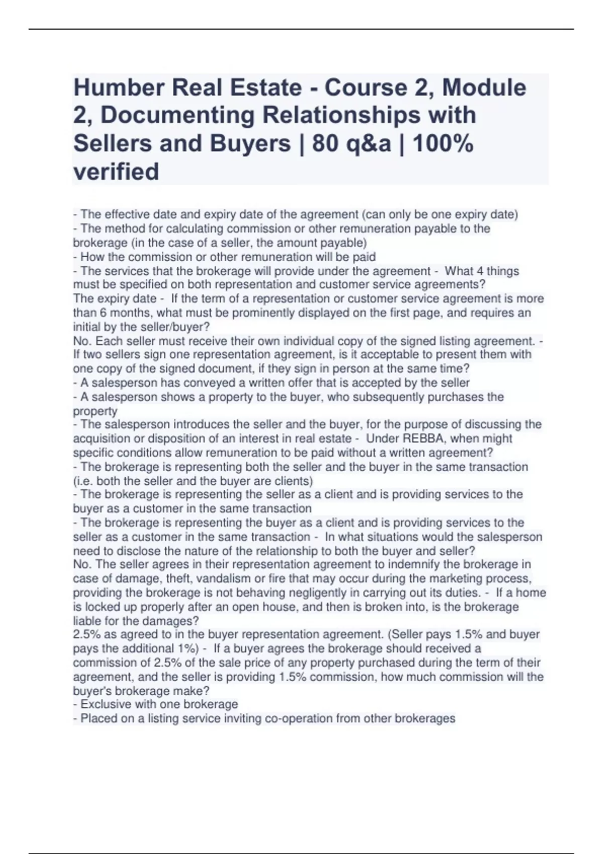 Humber Real Estate - Course 2, Module 2, Documenting Relationships with Sellers and Buyers | 80 q&a | 100% verified