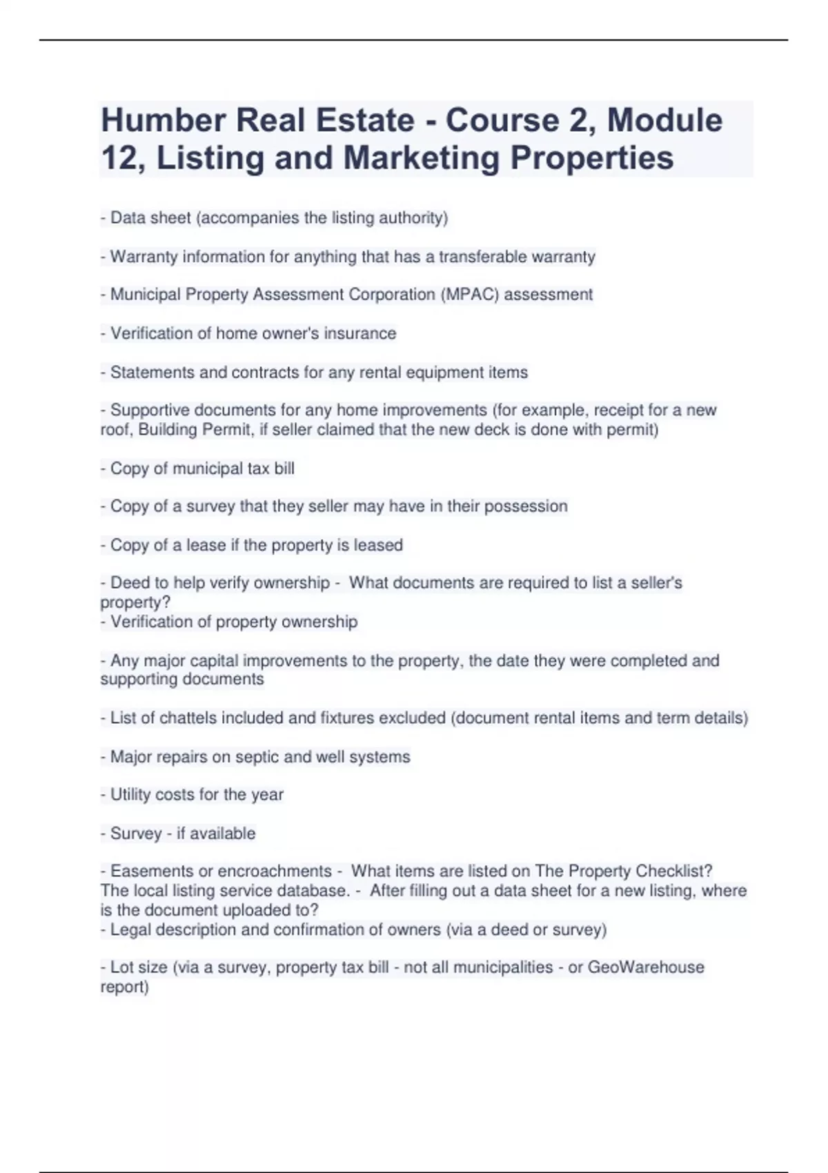 Humber Real Estate - Course 2, Module 12, Listing and Marketing Properties - Data sheet (accompanies the listing authority) - Warranty information for anything that has a transferable warranty - Municipal Property Assessment Corporation (MPAC) assessment - Verification of home owner's insurance - Statements and contracts for any rental equipment items - Supportive documents for any home improvements (for example, receipt for a new roof, Building Permit, if seller claimed that the new deck is done with permit) - Copy of municipal tax bill - Copy of a survey that they seller may have in their possession - Copy of a lease if the property is leased - Deed to help verify ownership - What documents are required to list a seller's property? - Verification of property ownership - Any major capital improvements to the property, the date they were completed and supporting documents - List of chattels included and fixtures excluded (document rental items and term details) - Major repairs on septic and well systems - Utility costs for the year - Survey - if available - Easements or encroachments - What items are listed on The Property Checklist? The local listing service database. - After filling out a data sheet for a new listing, where is the document uploaded to? - Legal description and confirmation of owners (via a deed or survey) - Lot size (via a survey, property tax bill - not all municipalities - or GeoWarehouse report) - Age of principal structure(s) (via seller, original owner, builder or sometimes municipality records i.e. a building permit and/or a GeoWarehouse report) NOTE: *If age is unknown or approx. age is indicated only, you as a salesperson must clearly identify this fact in the listing or any marketing. - Living area of principal structure(s) (take your own measurements or use verified source documents such as a floor plan or GeoWarehouse reports) - Room sizes - Assessment/taxes - Zoning - Wiring - Plumbing - HVAC (heating, ventilation and air conditioning) - Chattles/fixtures - Rental equipment - What information is included in a listing Data Sheet? Frontage and depth - If a lot is rectangular, what details are required when listing the lot size? Full dimensions - If a lot is irregular, what details are required when listing the lot size? Dimensions and/or exact acreage. - If a lot is a larger tract of land, what details are required when listing lot size? No. - Do you include a garage if it is attached when measuring total living area? No. In some areas, just a range in area is provided. - Is including square footage for a listing always mandatory? False. It's not mandatory. - True or false? It is mandatory in all areas to list the source when the square footage is a requirement on a data sheet. False. This is beyond the expertise of a salesperson and is not generally a mandatory field on a residential data sheet. - True or false? When detailing an electrical system on a data sheet, the determination of the system capacity is mandatory. 15 - Heating and air conditioning systems older than ____ years are more likely to become increasingly unreliable and may need to be replaced. Limited service listing - A listing which takes advantage of an a la carte / fee-based commission structure is also called a _______ ________ _________. A second rate of commission identified in the listing agreement, which would take effect under certain circumstances. - What is a 'Collateral Agreement'? - If there is no co-operating brokerage involved in the transaction and the listing brokerage sells the property to a buyer, this provides for a reduction in the commission paid. - If the seller is selling their home privately and has an interested buyer. The seller then decides to list the property and signs a representation agreement but requests to have the potential buyer excluded from the agreement.