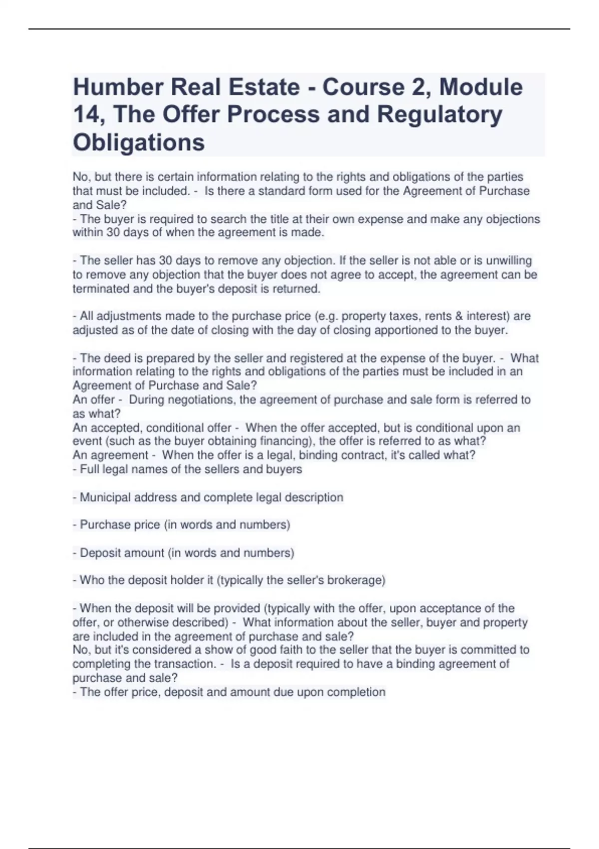Humber Real Estate - Course 2, Module 14, The Offer Process and Regulatory Obligations No, but there is certain information relating to the rights and obligations of the parties that must be included. - Is there a standard form used for the Agreement of Purchase and Sale? - The buyer is required to search the title at their own expense and make any objections within 30 days of when the agreement is made. - The seller has 30 days to remove any objection. If the seller is not able or is unwilling to remove any objection that the buyer does not agree to accept, the agreement can be terminated and the buyer's deposit is returned. - All adjustments made to the purchase price (e.g. property taxes, rents & interest) are adjusted as of the date of closing with the day of closing apportioned to the buyer. - The deed is prepared by the seller and registered at the expense of the buyer. - What information relating to the rights and obligations of the parties must be included in an Agreement of Purchase and Sale? An offer - During negotiations, the agreement of purchase and sale form is referred to as what? An accepted, conditional offer - When the offer accepted, but is conditional upon an event (such as the buyer obtaining financing), the offer is referred to as what? An agreement - When the offer is a legal, binding contract, it's called what? - Full legal names of the sellers and buyers - Municipal address and complete legal description - Purchase price (in words and numbers) - Deposit amount (in words and numbers) - Who the deposit holder it (typically the seller's brokerage) - When the deposit will be provided (typically with the offer, upon acceptance of the offer, or otherwise described) - What information about the seller, buyer and property are included in the agreement of purchase and sale? No, but it's considered a show of good faith to the seller that the buyer is committed to completing the transaction. - Is a deposit required to have a binding agreement of purchase and sale? - The offer price, deposit and amount due upon completion - Terms, conditions or other clauses required to address the needs or concerns of the buyer - Irrevocable date - Completion date (aka Closing) - Title search date (aka Requisition Date) - Chattels and fixtures - Conditions & applicable dates - What are the key components of an Agreement of Purchase and Sale? Vacant possession Note: In instances where the buyer has agreed to assume an existing tenancy, vacant possession would not be given. - In most instances, the seller agrees to provide _________ _________ on the date of closing. Business *Excludes Saturdays, Sundays, & stat holidays as the Land Registry Offices are closed. - The completion date must be a __________ day. The time period in which the buyer's lawyer completes a search at the Land Registry Office. - What is the Requisition Date as included in an Agreement of Purchase and Sale? To review the information registered on the title and provide an opinion on these matters, such as confirmation of ownership, any mortgage or lien registered, or any easement affecting the property. - What is the purpose of a lawyer's search at the Land Registry Office? 1. Initiate the offer 2. Draft the offer 3. Register the offer with the seller's brokerage 4. Present the offer to the seller 5. Await the seller's response to the offer - What are the steps in preparing an offer from the buyer's perspective? - Review the listing (confirm all info via GeoWarehouse, etc.) - Contact the salesperson (enquire if there are any other offers registered on the property) - Complete a comparative market analysis (CMA) - Obtain details from the buyer - Organize the required information - What are steps required in preparation of drafting an offer? There is an offer signed by a buyer which may or may not have already been presented to the seller. - What is the definition of a 'Registered Offer'? Competing offers - If more than one registered offer occurs it is referred to as what? It could impact the buyer's decisions regarding the terms of the offer, including whether to continue with making an offer. - Why is it important for a buyer to know if there are other offers, and the number of competing offers? Once presented to the seller, the offer becomes binding. - At what point can an offer not be withdr