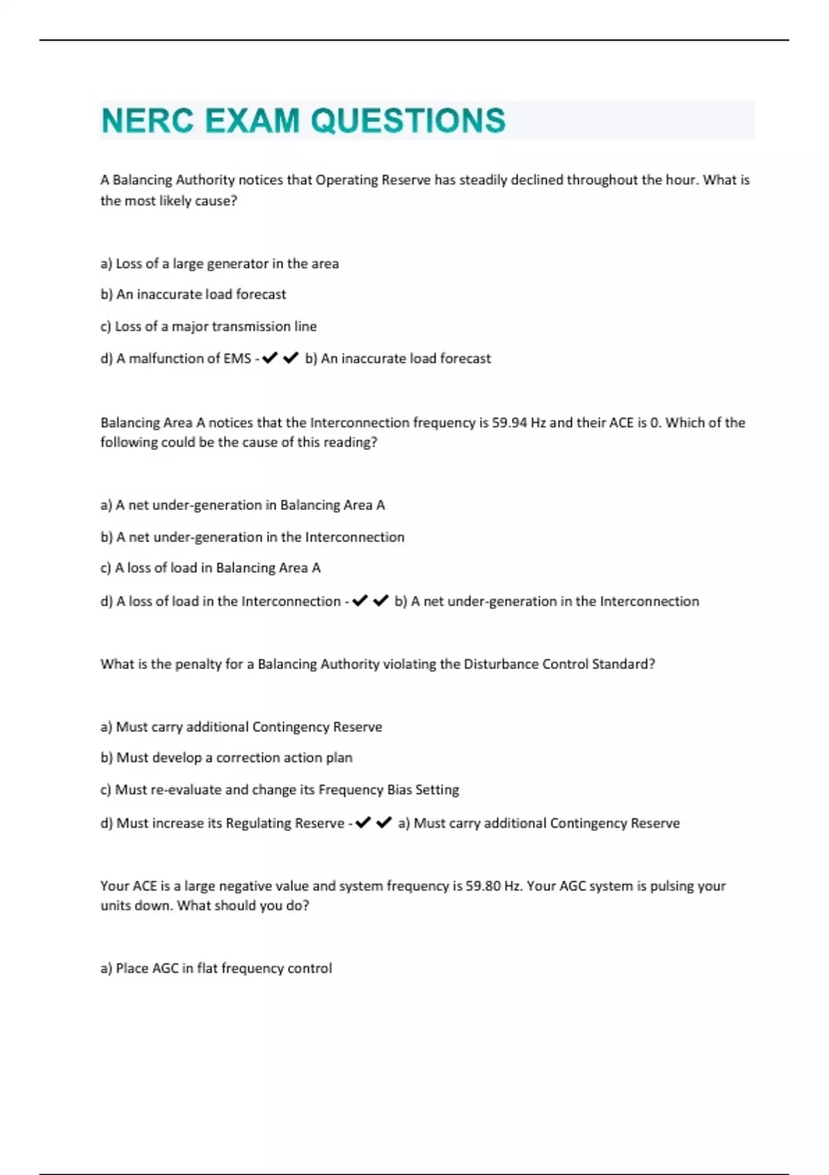 A Balancing Authority notices that Operating Reserve has steadily declined throughout the hour. What is the most likely cause? a) Loss of a large generator in the area b) An inaccurate load forecast c) Loss of a major transmission line d) A malfunction of EMS - b) An inaccurate load forecast Balancing Area A notices that the Interconnection frequency is 59.94 Hz and their ACE is 0. Which of the following could be the cause of this reading? a) A net under-generation in Balancing Area A b) A net under-generation in the Interconnection c) A loss of load in Balancing Area A d) A loss of load in the Interconnection - b) A net under-generation in the Interconnection What is the penalty for a Balancing Authority violating the Disturbance Control Standard? a) Must carry additional Contingency Reserve b) Must develop a correction action plan c) Must re-evaluate and change its Frequency Bias Setting d) Must increase its Regulating Reserve - a) Must carry additional Contingency Reserve Your ACE is a large negative value and system frequency is 59.80 Hz. Your AGC system is pulsing your units down. What should you do? a) Place AGC in flat frequency controlb) Place AGC in flat tie line control c) Suspend AGC and investigate d) Do nothing as this is normal - c) Suspend AGC and investigate