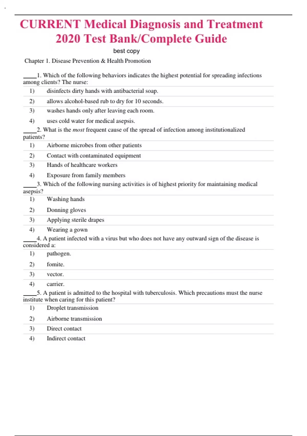 CURRENT Medical Diagnosis and Treatment 2020 59th Edition Papadakis, McPhee Test Bank CURRENT Medical Diagnosis and Treatment 2019 Testbank/Studyguide Chapter 1. Disease Prevention & Health Promotion 1. Which of the following behaviors indicates the highest potential for spreading infections among clients? The nurse: 1) disinfects dirty hands with antibacterial soap. 2) allows alcohol-based rub to dry for 10 seconds. 3) washes hands only after leaving each room. 4) uses cold water for medical asepsis. 2. What is the most frequent cause of the spread of infection among institutionalized patients? 1) Airborne microbes from other patients 2) Contact with contaminated equipment 3) Hands of healthcare workers 4) Exposure from family members 3. Which of the following nursing activities is of highest priority for maintaining medical asepsis? 1) Washing hands 2) Donning gloves 3) Applying sterile drapes 4) Wearing a gown 4. A patient infected with a virus but who does not have any outward sign of the disease is considered a: 1) pathogen. 2) fomite. 3) vector. 4) carrier. 5. A patient is admitted to the hospital with tuberculosis. Which precautions must the nurse institute when caring for this patient? 1) Droplet transmission 2) Airborne transmission 3) Direct contact 4) Indirect contact