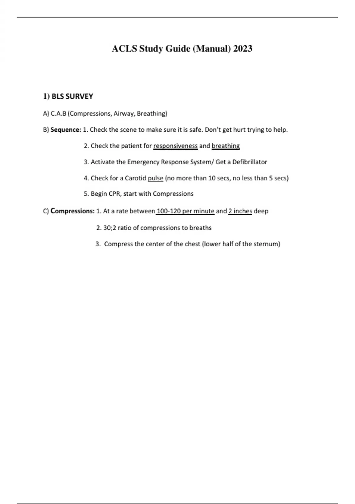 ACLS Study Guide (Manual) 2023 1) CLASS INTRODUCTION A) Instructor and student introduction -be prepared to actively participate B) Class philosophy -Don’t rush when providing care, but be aggressive (ex: Straight to the point, assertive, loud enough for people to hear, confident, specific) Note: when you rush you make mistakes and/or create safety issues. When you are not aggressive, communication is poor. C) Class format 1. Lecture/Videos 2. Practice 3. Test; skills test, 50 question written exam