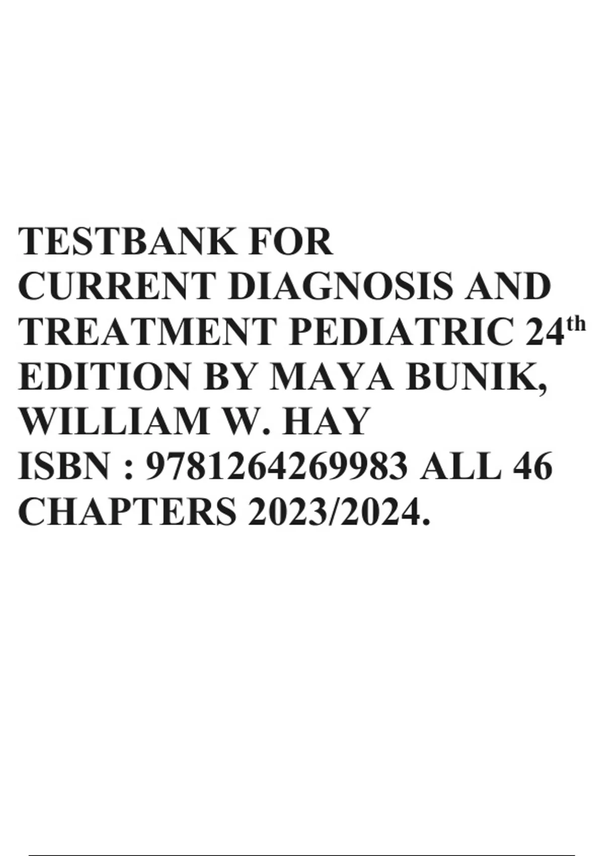 TESTBANK FOR CURRENT DIAGNOSIS AND TREATMENT PEDIATRIC 24th EDITION BY MAYA BUNIK, WILLIAM W. HAY ISBN : 9781264269983 ALL 46 CHAPTERS 2023/2024.