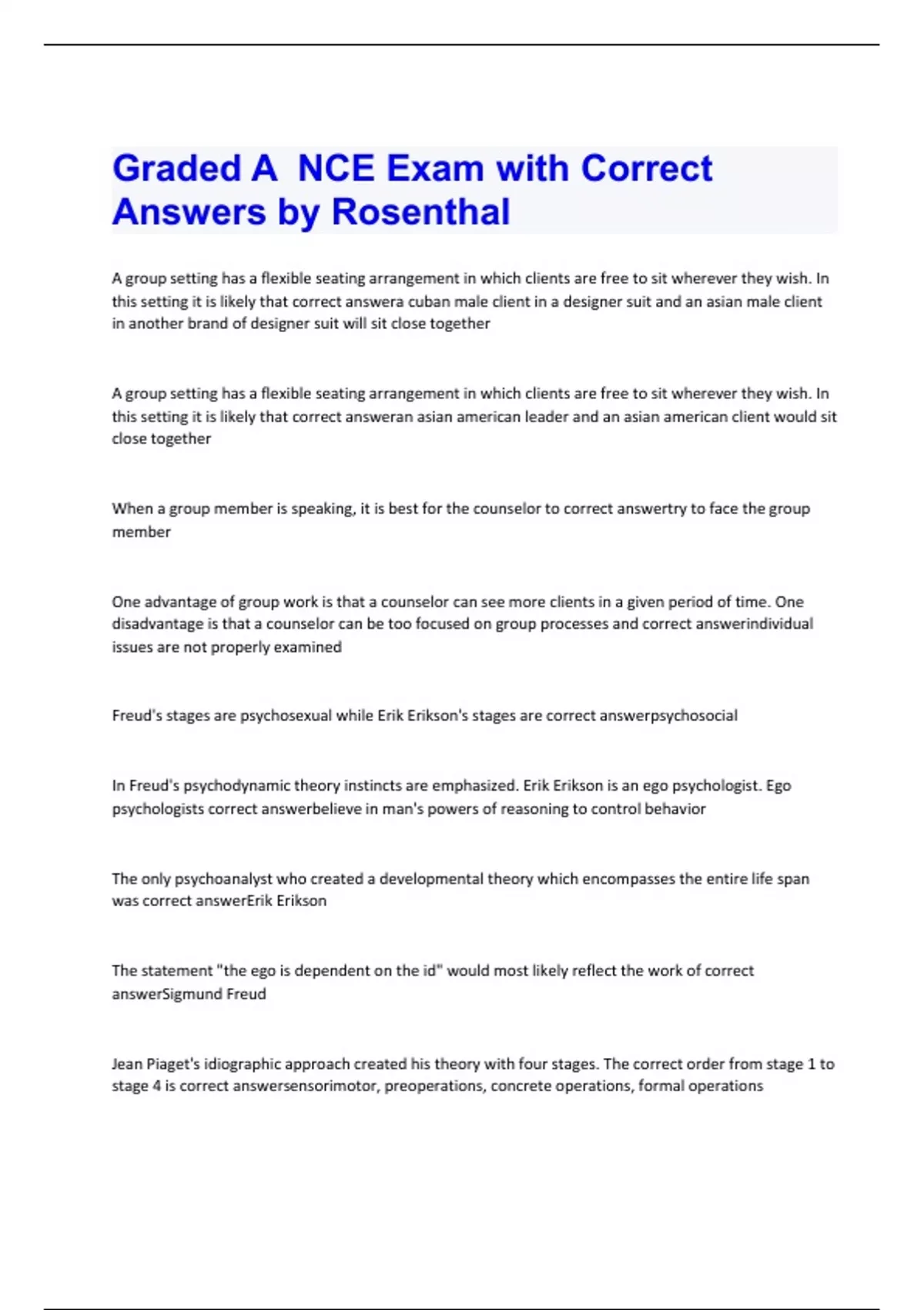 A group setting has a flexible seating arrangement in which clients are free to sit wherever they wish. In this setting it is likely that correct answera cuban male client in a designer suit and an asian male client in another brand of designer suit will sit close together A group setting has a flexible seating arrangement in which clients are free to sit wherever they wish. In this setting it is likely that correct answeran asian american leader and an asian american client would sit close together When a group member is speaking, it is best for the counselor to correct answertry to face the group member One advantage of group work is that a counselor can see more clients in a given period of time. One disadvantage is that a counselor can be too focused on group processes and correct answerindividual issues are not properly examined Freud's stages are psychosexual while Erik Erikson's stages are correct answerpsychosocial In Freud's psychodynamic theory instincts are emphasized. Erik Erikson is an ego psychologist. Ego psychologists correct answerbelieve in man's powers of reasoning to control behavior The only psychoanalyst who created a developmental theory which encompasses the entire life span was correct answerErik Erikson The statement "the ego is dependent on the id" would most likely reflect the work of correct answerSigmund Freud Jean Piaget's idiographic approach created his theory with four stages. The correct order from stage 1 to stage 4 is correct answersensorimotor, preoperations, concrete operations, formal operations Some behavioral scientists have been critical of the Swiss child psychologist Jean Piaget's developmental research inasmuch as correct answerhis findings were often derived from observing his own children A tall skinny pitcher of water is emptied into a small squatty pitcher. A child indicates that she feels the small pitcher has less water. The child has not yet mastered correct answerconservation In Piagetian literature, conservation would most likely refer to correct answervolume or mass A child masters conservation in the Piagetian stage known as correct answerconcrete operations -- ages 7-11 _____ expanded on Piaget's conceptualization of moral development correct answerLawrence Kohlberg According to Jean Piaget, a child masters the concept of reversibility in the third stage, known as concrete operations or concrete operational thought. This notion suggests correct answerone can undo an action, hence an object (say a glass of water) can return to its initial shape During a thunderstorm, a 6-year-old child in Piaget's stage of preoperational thought (stage 2) says, "The rain is following me." This is an example of correct answeregocentrism Lawrence Kohlberg suggested correct answerthree levels of morality The Heinz dilemma is to Kohlberg's theory as correct answera typing test is to the level of typing skill mastered. The term identity crisis comes from the work of correct answerErikson Kohlberg's three levels of morality are correct answerpreconventional, conventional, postconventional trust versus mistrust is correct answerthe basis of morality according to Kohlberg