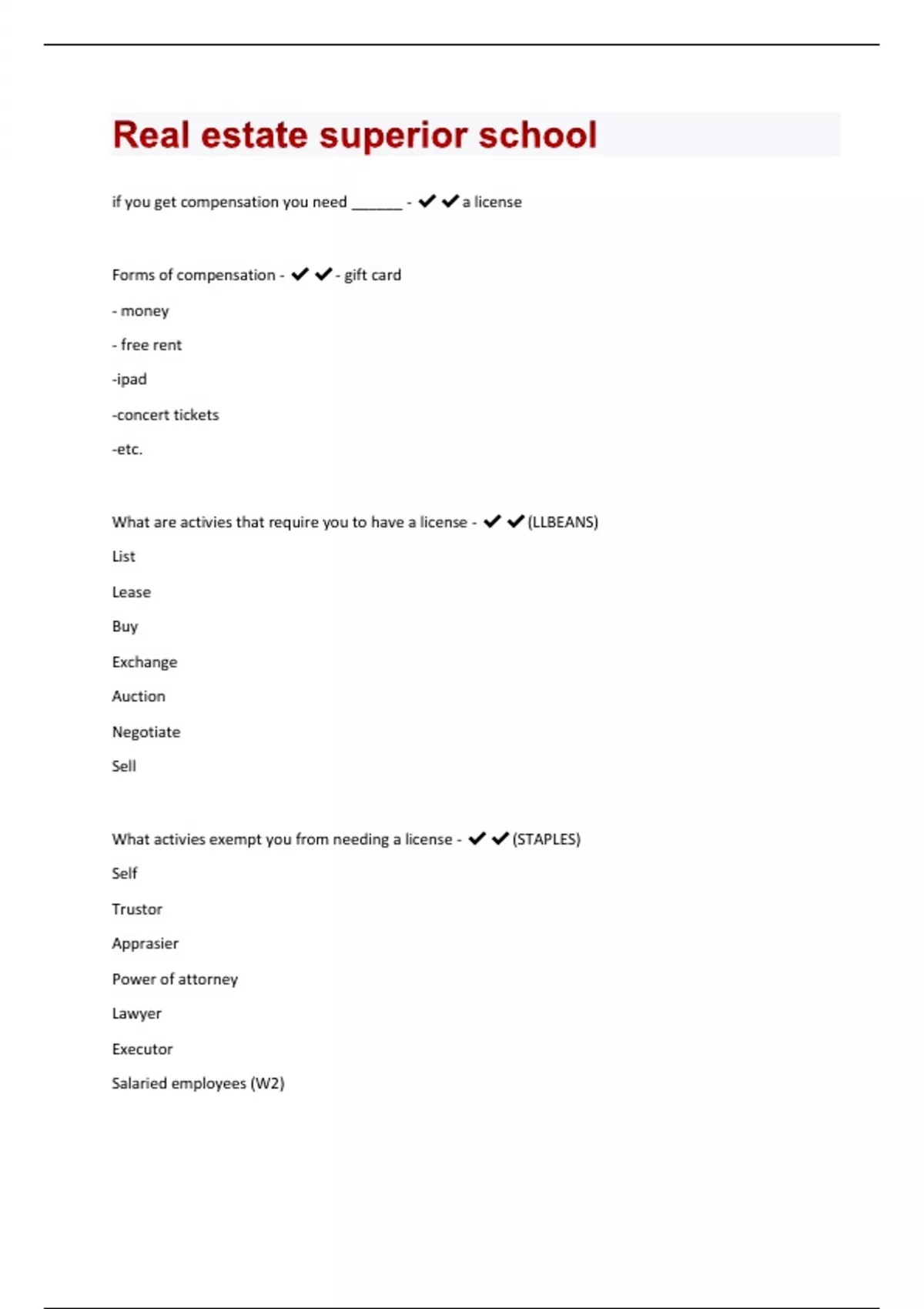 if you get compensation you need ______ - a license Forms of compensation - - gift card - money - free rent -ipad -concert tickets -etc. What are activies that require you to have a license - (LLBEANS) List Lease Buy Exchange Auction Negotiate Sell What activies exempt you from needing a license - (STAPLES) Self Trustor Apprasier Power of attorney Lawyer Executor Salaried employees (W2)Practicing real esate without a license is what - Felony Salary is an exemption from ______ - compensation Types of licenses - Provisional Broker Non-provisional Broker in charge Limited non resident commercial license Provisional - entry level license Must be supervised by BIC (broker in charge) can only be under one BIC at a time Must take 90 hours of post edu after is must be completed 3 years after on your anniversary date Non provisional - licensee who has completed all post licensing coures is also called a full broker can be under more than one BIC as long as all BIC agree What needs to be done June 10th of every year - 8 hours of continuing education 4 hours of general update , 4 hours of electives Provisional brokers are exempt from the first june 10th) what needs to be done June 30th of every year - Renew your license and pay 45$ fee Not doing any of these things will make your license inactive - Not being affiliation with a BIC Not being current on your MCE( mandatory continuing edu) Not being current on your post licensing eduNot doing what will make your license expired - NOT PAYING YOUR 45$ fee to renew your license Limited non-resident Commerical Broker's License - limited to commercial transactions (lease or purchases)