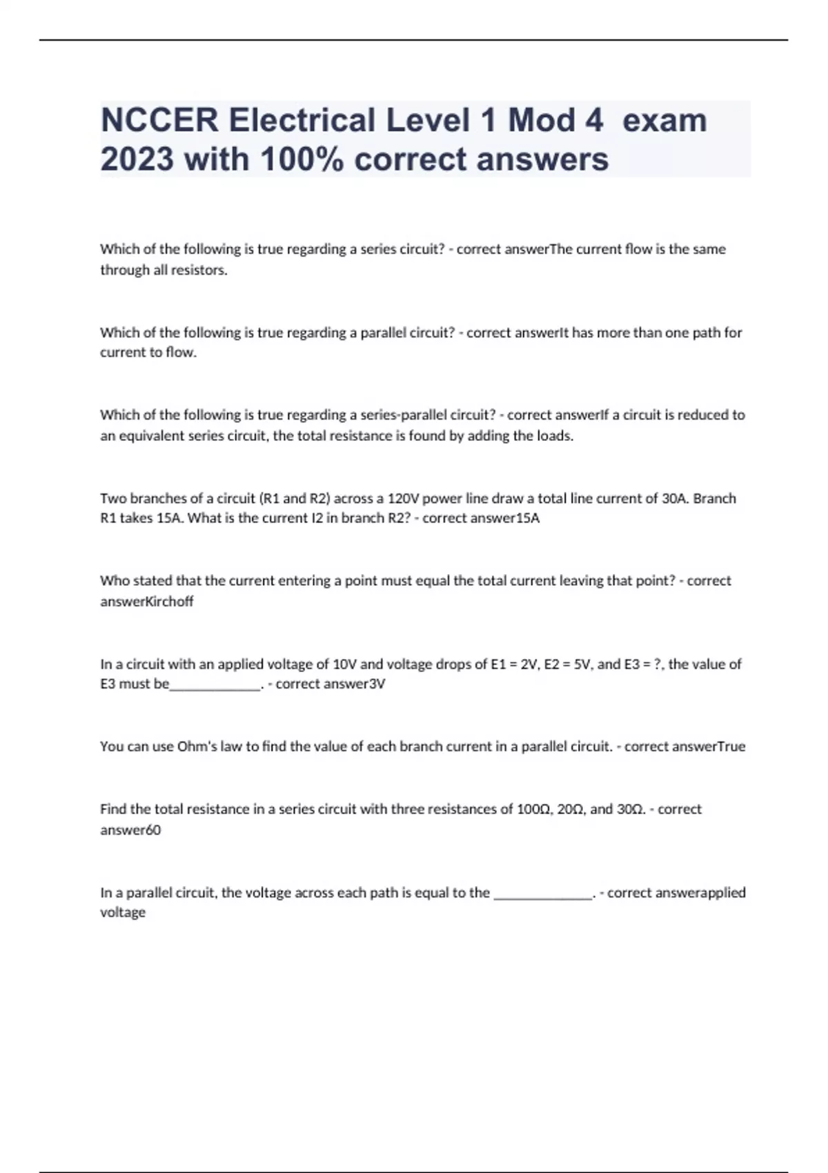 Which of the following is true regarding a series circuit? - correct answerThe current flow is the same through all resistors. Which of the following is true regarding a parallel circuit? - correct answerIt has more than one path for current to flow. Which of the following is true regarding a series-parallel circuit? - correct answerIf a circuit is reduced to an equivalent series circuit, the total resistance is found by adding the loads. Two branches of a circuit (R1 and R2) across a 120V power line draw a total line current of 30A. Branch R1 takes 15A. What is the current I2 in branch R2? - correct answer15A Who stated that the current entering a point must equal the total current leaving that point? - correct answerKirchoff In a circuit with an applied voltage of 10V and voltage drops of E1 = 2V, E2 = 5V, and E3 = ?, the value of E3 must be____________. - correct answer3V You can use Ohm's law to find the value of each branch current in a parallel circuit. - correct answerTrue Find the total resistance in a series circuit with three resistances of 100Ω, 20Ω, and 30Ω. - correct answer60 In a parallel circuit, the voltage across each path is equal to the _____________. - correct answerapplied voltage