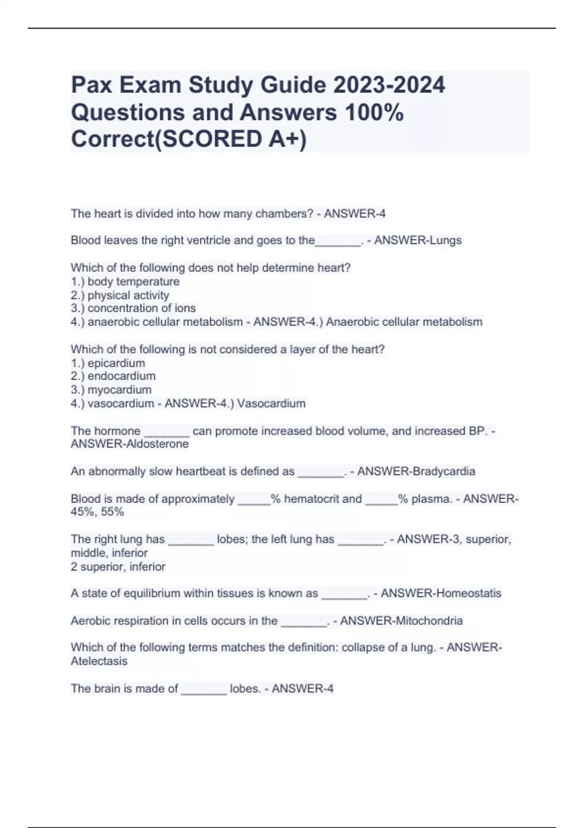 The heart is divided into how many chambers? - ANSWER-4 Blood leaves the right ventricle and goes to the_______. - ANSWER-Lungs Which of the following does not help determine heart? 1.) body temperature 2.) physical activity 3.) concentration of ions 4.) anaerobic cellular metabolism - ANSWER-4.) Anaerobic cellular metabolism Which of the following is not considered a layer of the heart? 1.) epicardium 2.) endocardium 3.) myocardium 4.) vasocardium - ANSWER-4.) Vasocardium The hormone _______ can promote increased blood volume, and increased BP. - ANSWER-Aldosterone An abnormally slow heartbeat is defined as _______. - ANSWER-Bradycardia Blood is made of approximately _____% hematocrit and _____% plasma. - ANSWER-45%, 55% The right lung has _______ lobes; the left lung has _______. - ANSWER-3, superior, middle, inferior 2 superior, inferior A state of equilibrium within tissues is known as _______. - ANSWER-Homeostatis