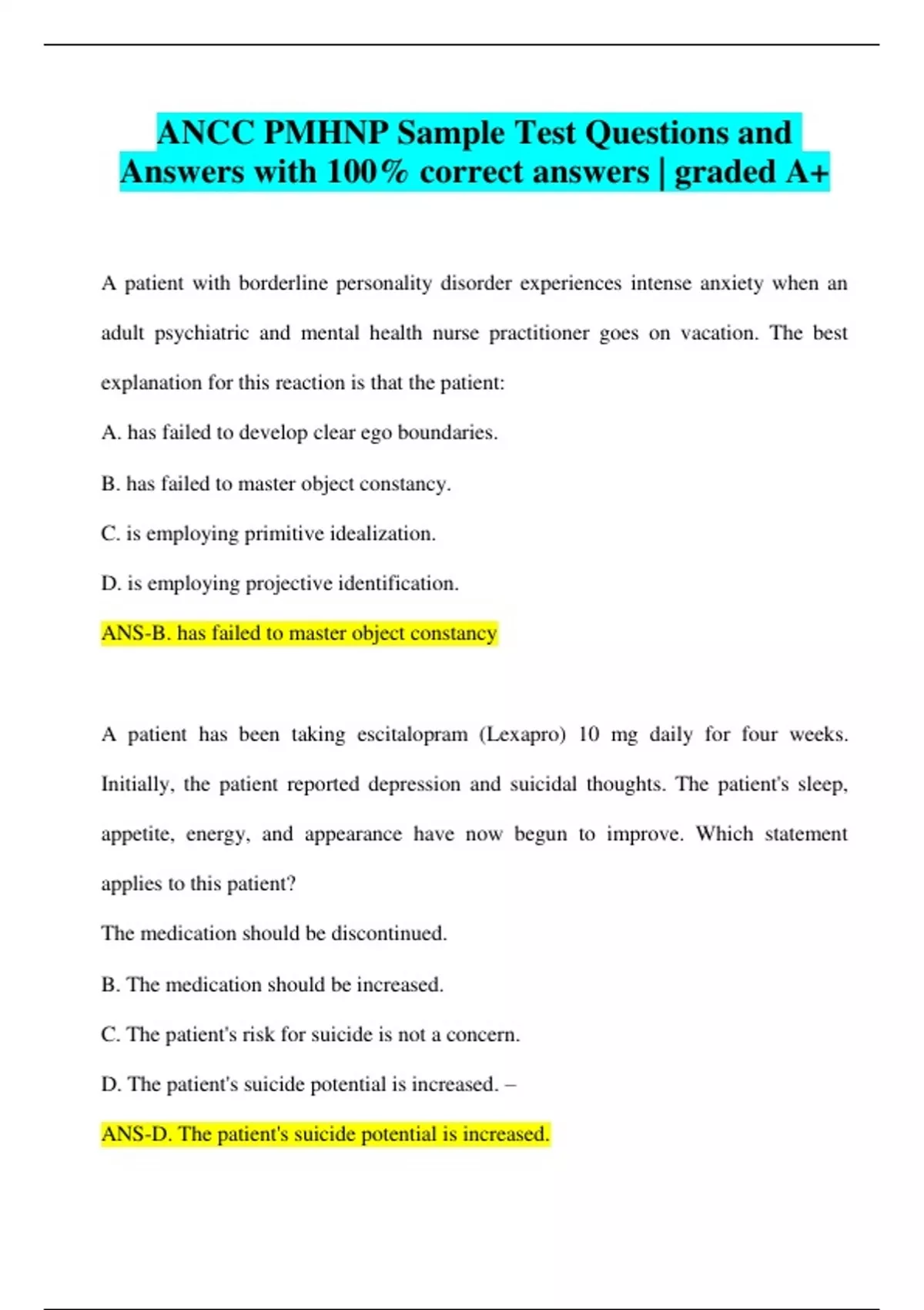 A patient with borderline personality disorder experiences intense anxiety when an adult psychiatric and mental health nurse practitioner goes on vacation. The best explanation for this reaction is that the patient: A. has failed to develop clear ego boundaries. B. has failed to master object constancy. C. is employing primitive idealization. D. is employing projective identification. ANS-B. has failed to master object constancy A patient has been taking escitalopram (Lexapro) 10 mg daily for four weeks. Initially, the patient reported depression and suicidal thoughts. The patient's sleep, appetite, energy, and appearance have now begun to improve. Which statement applies to this patient? The medication should be discontinued. B. The medication should be increased. C. The patient's risk for suicide is not a concern. D. The patient's suicide potential is increased. – ANS-D. The patient's suicide potential is increased.